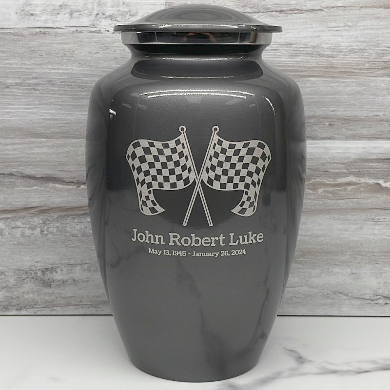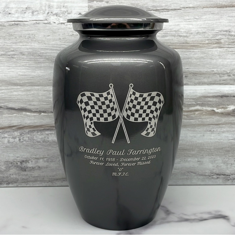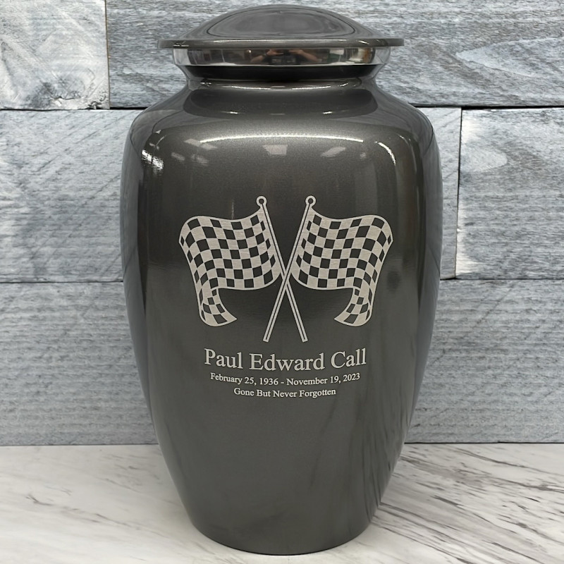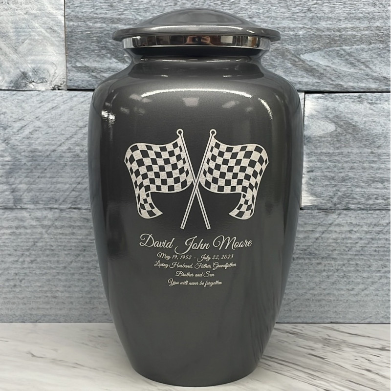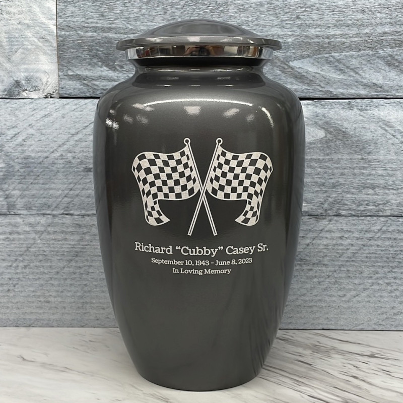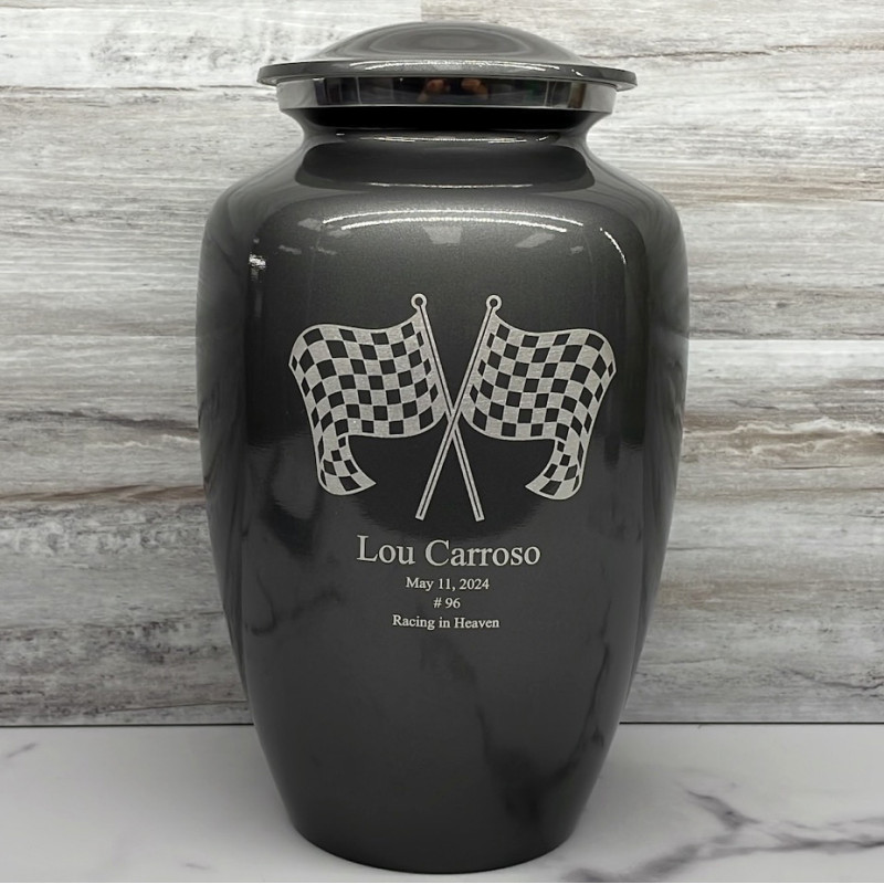 Celebrate your loved one's passion for racing with our Checkered Flag Urn in Gunmetal Gray. The metallic gray color and finish provides a stunning contrast to your artwork and engraving choices. For this reason, our Gunmetal Gray Urn the most popular urn we sell.