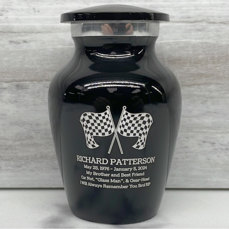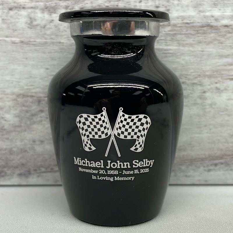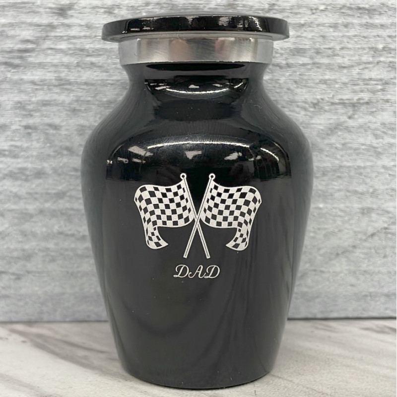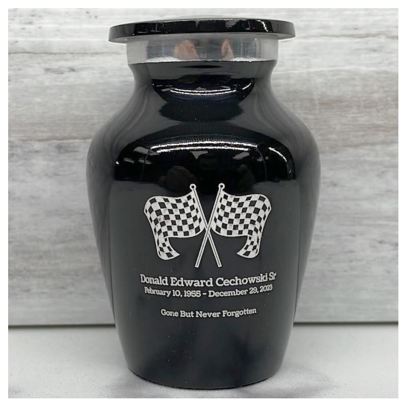 Choose a Race Checkered Flag Keepsake Urn to create an intimate and personal memorial for family members or close friends. Bold, attractive colors offer sharp contrast with the engraved text and artwork.