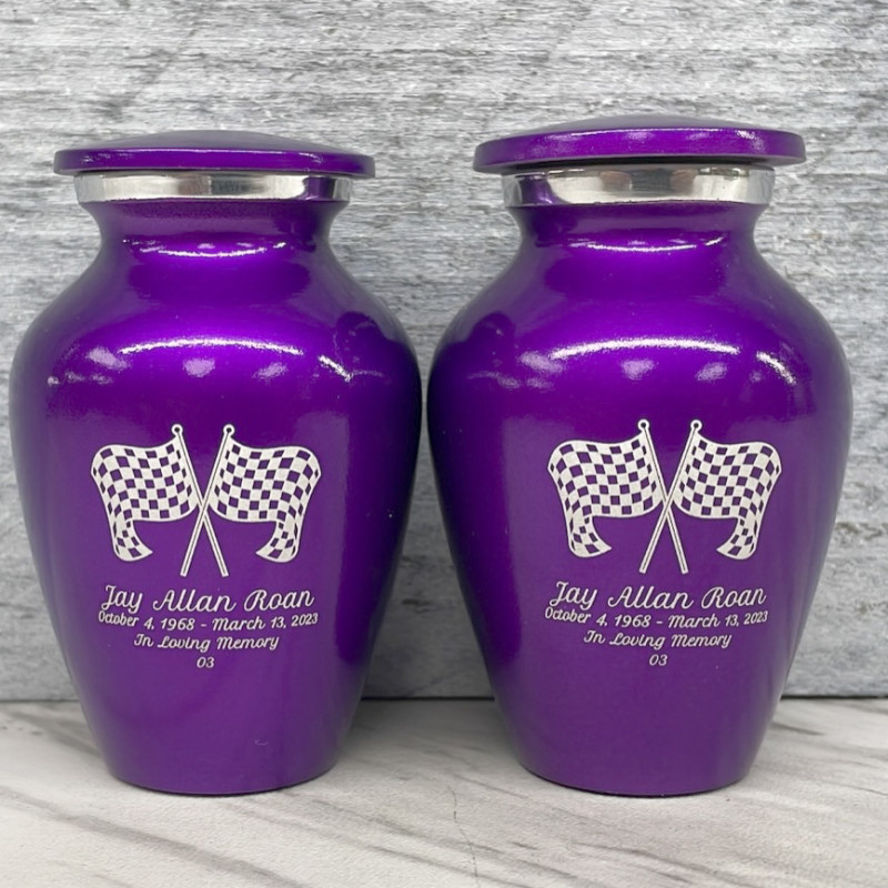 The Purple Luster Gray Race Checkered Flag Keepsake Cremation Urn is a beautiful way to memorialize your beloved automotive enthusiast. Optional engraving that includes names, dates and up to three sentiment lines allows for this personal urn to become completely customized for you, your family or your beloved close friends.