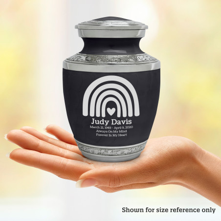 Select Rainbow Sharing Urn - Ebony Black to create a personal memorial that is a step larger than a keepsake urn but more petite than a full size urn. Bold, attractive colors offer sharp contrast with the engraved text and detailed artwork.