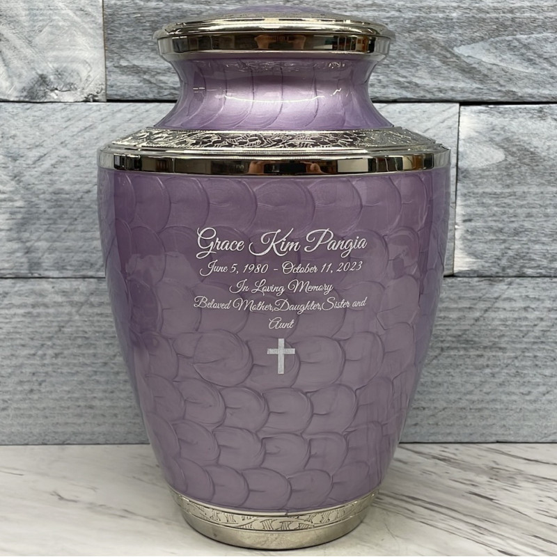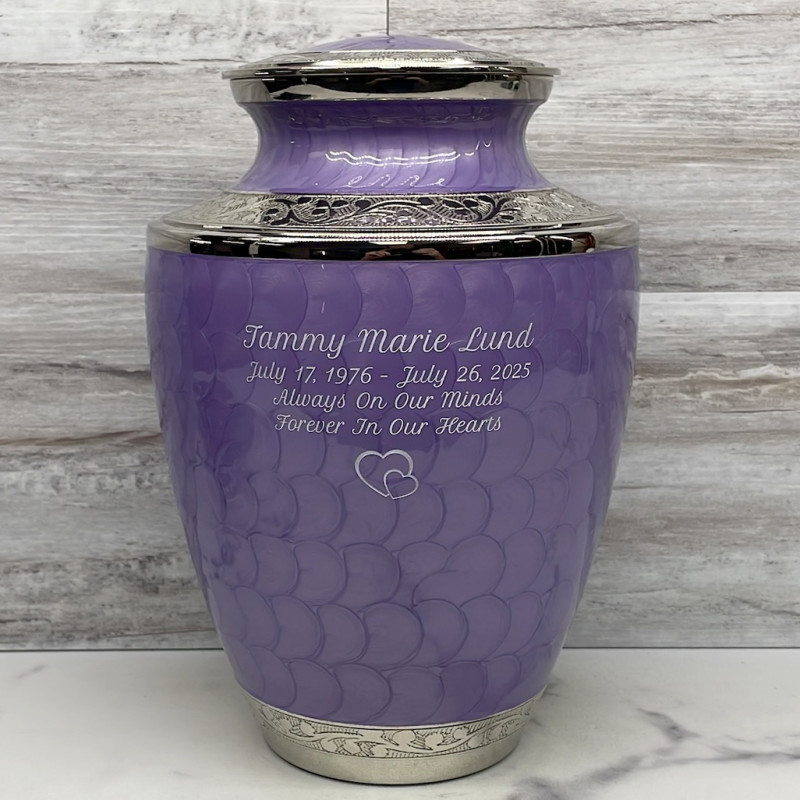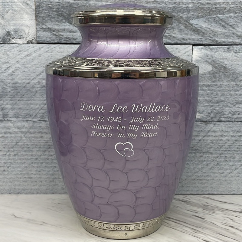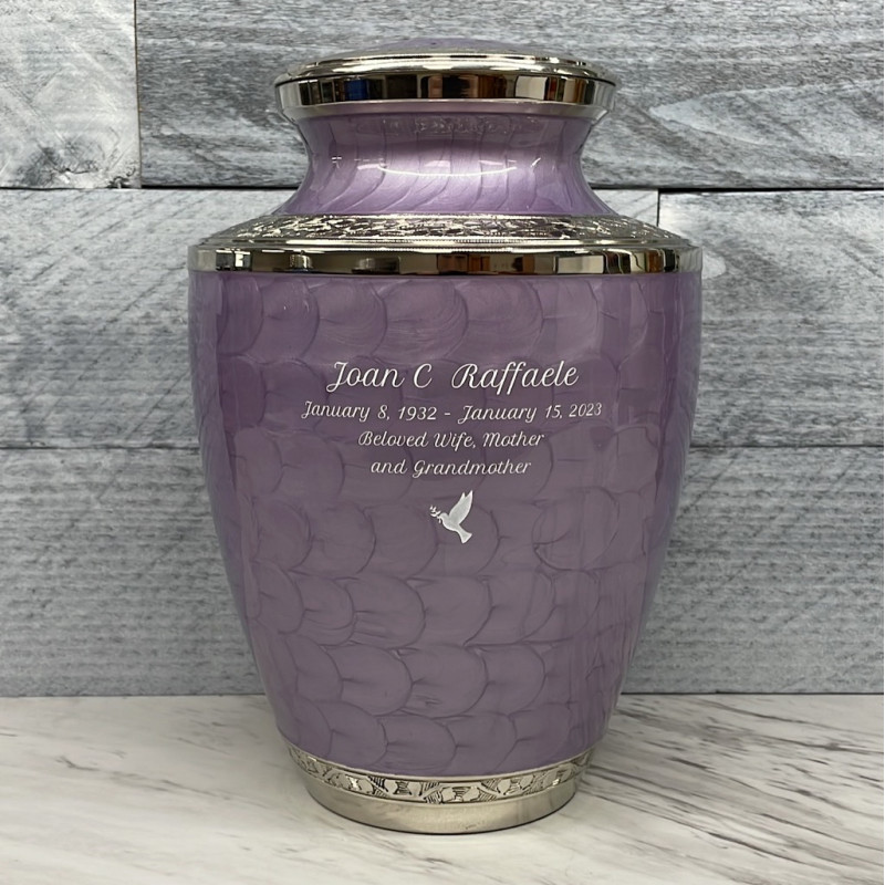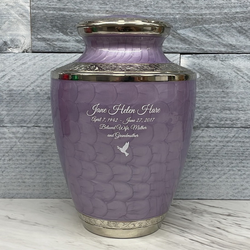 This stunning premium cremation urn is hand crafted and enameled in lavender to give your loved one's remains a place of eternal peace. This popular urn showcases grand detail and premium quality. Built to higher specifications than similar urns, the Regal Purple Cremation Urn from Green Meadow Memorials is an excellent value.