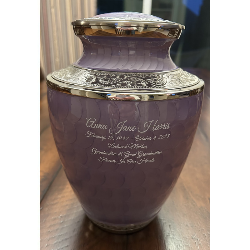 This stunning premium cremation urn is hand crafted and enameled in lavender to give your loved one's remains a place of eternal peace. This popular urn showcases grand detail and premium quality. Built to higher specifications than similar urns, the Regal Purple Cremation Urn from Green Meadow Memorials is an excellent value.