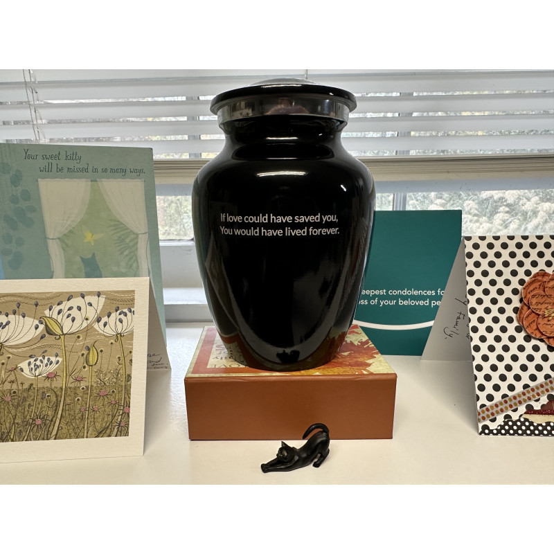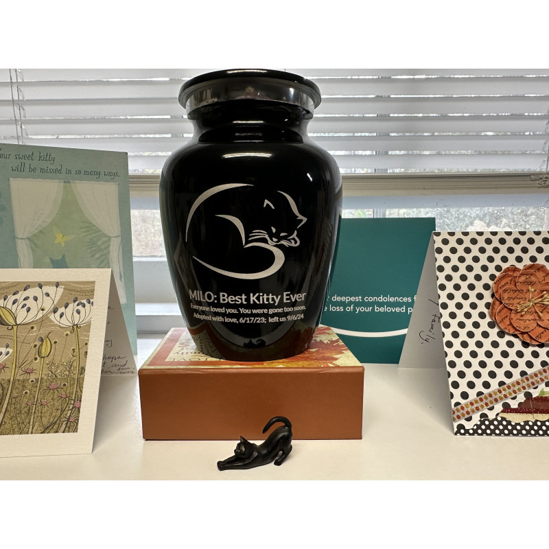Our beautiful and loving black cat Milo died too soon at age 4 after contracting Nocardiosis, a frequently fatal bacteria. Our hearts were broken to bits since we had been trying to heal him at great expense for 5 months. I looked for the right urn for his ashes for over a week with no luck until finding your company. Nat picked up the phone personally and was wonderfully kind.