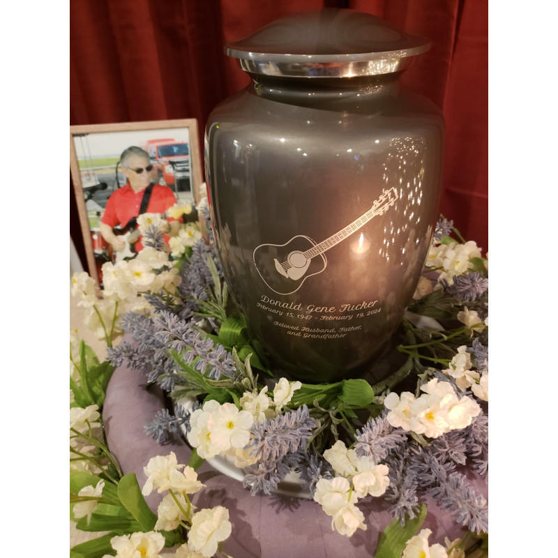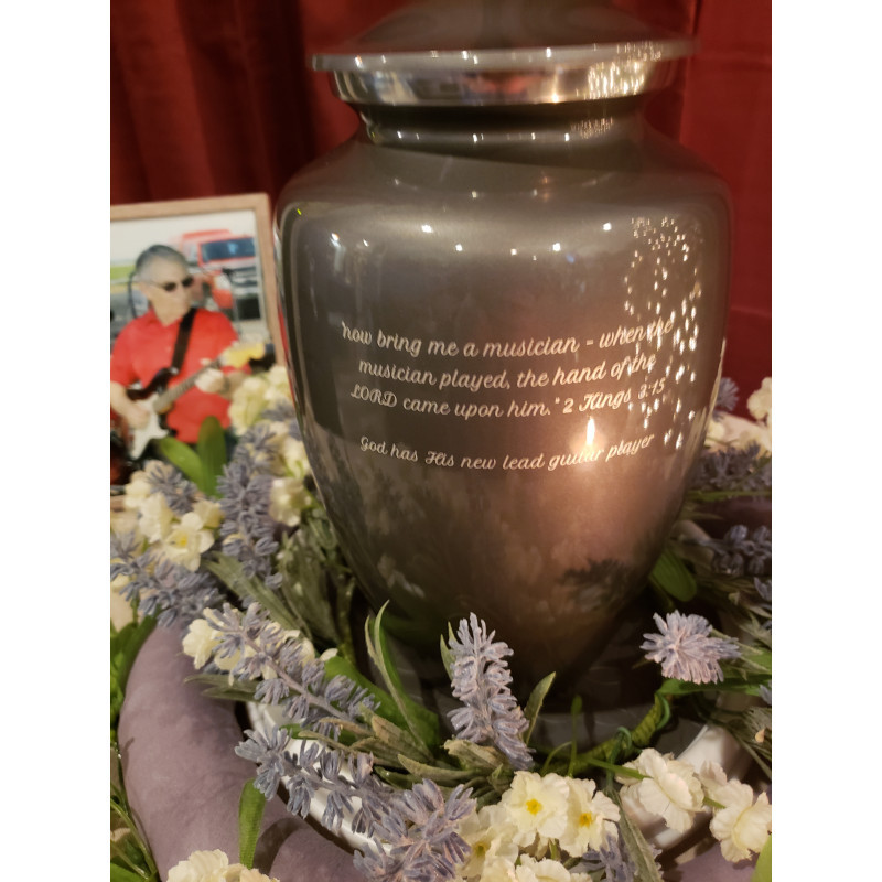 We ordered this urn for my dad. It is absolutely beautiful! It is not as dark as what is displayed on the website; it is a very pretty, shiny gray. We loved that we were able to see a preview of what the finished product would look like, really putting my mom's mind at ease. It is made of a high quality material and was so much more affordable than what the funeral home had to offer. As a matter of fact, when I went back to the funeral home to pick up my dad's remains, even the funeral home director asked if I minded if he showed it to a few other guests that were there at the time. Thank you, Green Meadow Memorials for making this part of the process so easy!