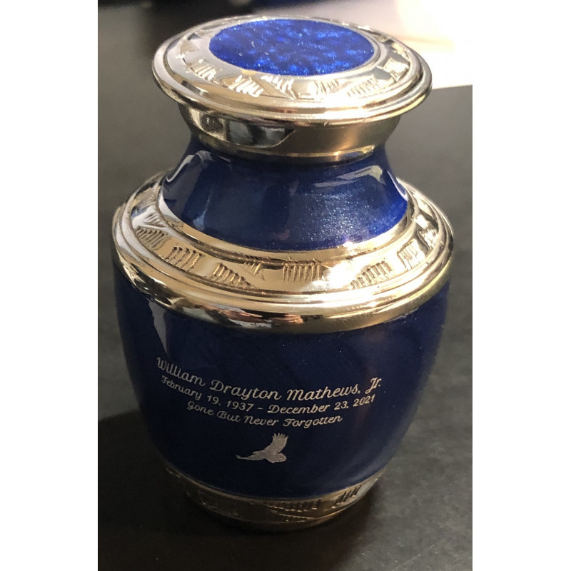 I was very happy with my mini urn. Finish was excellent. Writing was done very well..this was for my husband ashes and a few of my children got one too.