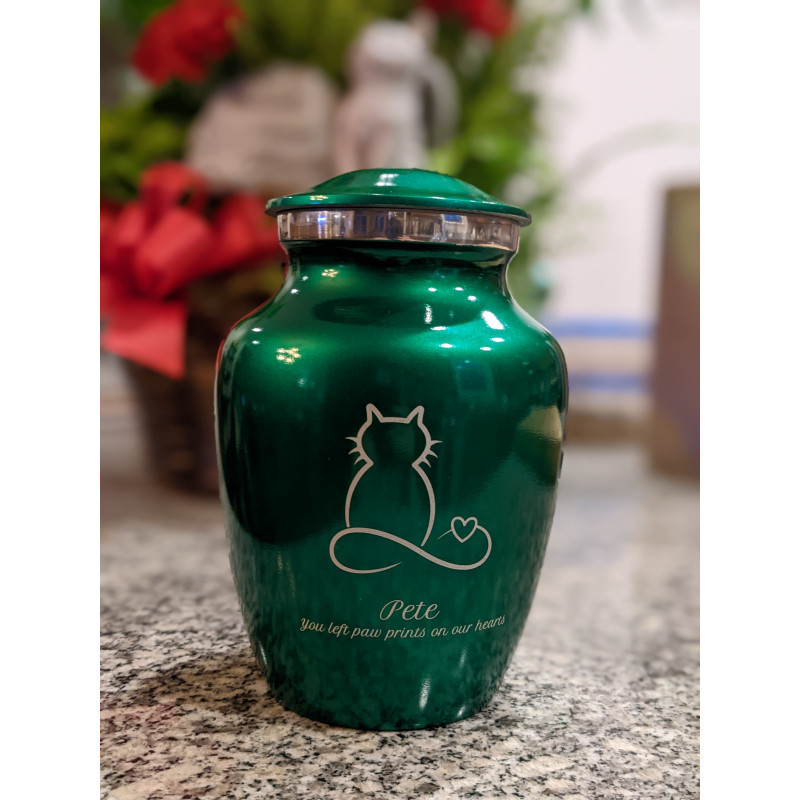 Our child wanted to honor our cat with a green urn that matched her eyes. I had no idea where to find a green urn, but was able to at Green Meadow Memorials. We were able to pick the container, color, graphic, and text personalization. We were pleased with the quality and how quickly it shipped!