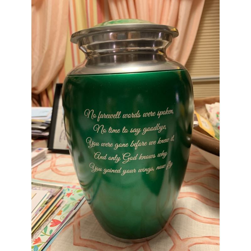 During these times it's so hard to know what to do. Shopping online for an urn is a tough process as most websites don't even show you how the engraving will look when done. I called customer service with a couple questions and they were extremely helpful and courteous. When the urn arrived it was so beautiful - i took pictures and shared with the family because it was so nice. If i ever have to do this again i will certainly buy from Green Meadow Memories again.