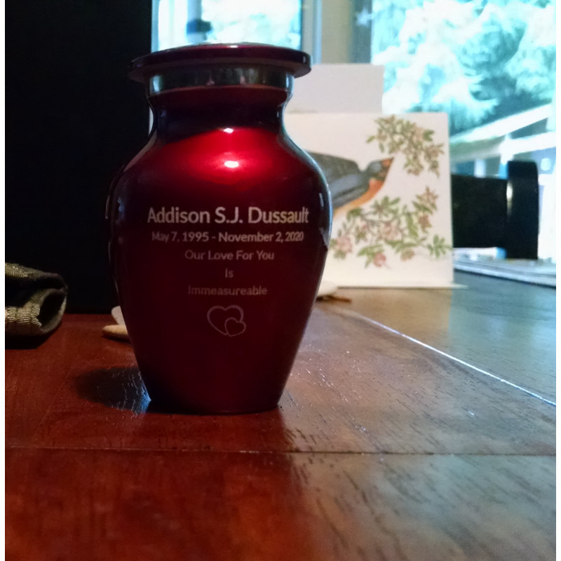 I needed a keepsake urn for my son who had always liked the color red. Red Vans, red t-shirts, red ball caps, even his Keurig was red, and your keepsake urn was just the right color. The website was so easy to use, including the engraving section, it all went nice and smooth. Your pricing is so affordable, and it arrived 2 days early. The loss of a young loved one is hard, but Green Meadow Memorials made this process easy. Thank you.