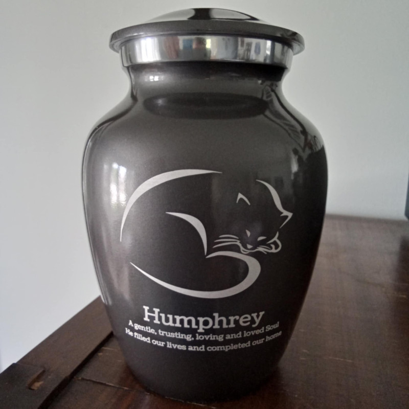 After saying goodbye to our adored feline family/friend Humphrey, we found Green Meadow Memorials was paws down the most appropriate resting place for his ashes. The urns are customizable so that one can make it a genuine and unique tribute. Within 24 hours of ordering, the urn was shipped. Prior to it arriving, I had a question and in less than 2 minutes after accessing Green Meadow Memorials' website, our phone rang with an answer. I had a very satisfying conversation with Nat, and from start to finish in my dealing with this company, I have been ultra-impressed. The urn itself is perfect; a quality finish in Humphrey's fur colour, with personalized testament front-and-back to his beautiful affect on our lives. Green Meadow Memorials offers the best urn options anywhere on the internet.