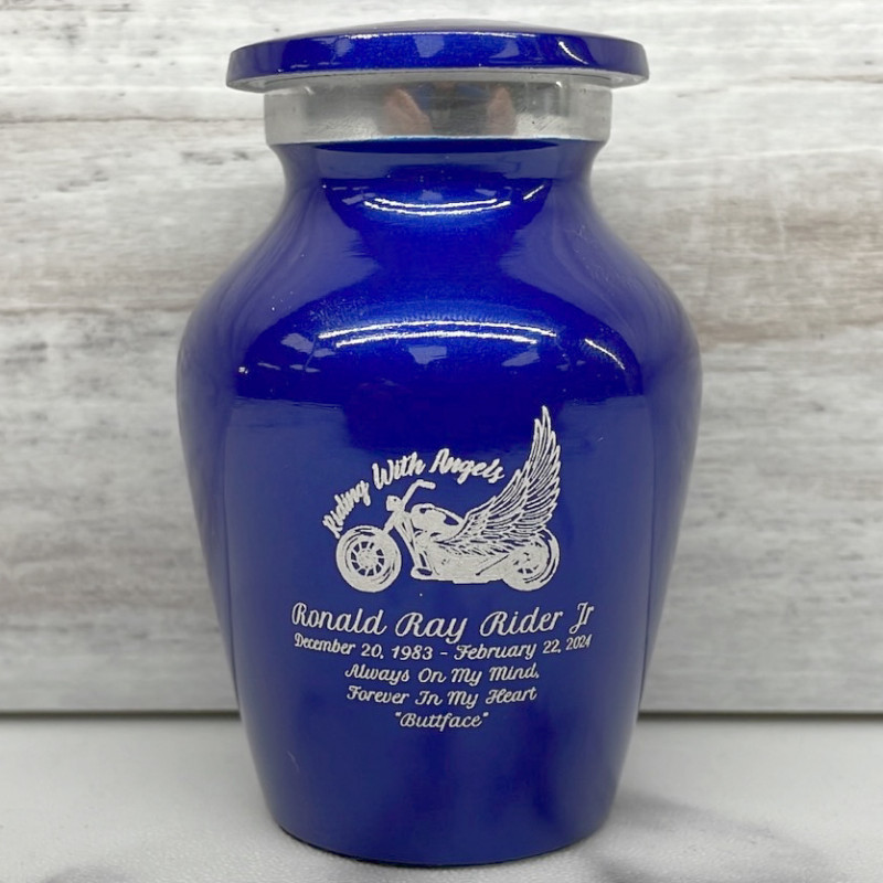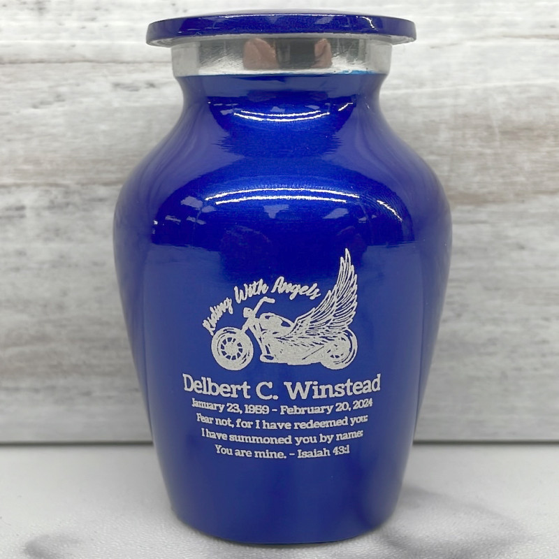 My husband lost one of his brothers last week. I wanted the perfect keepsake URN for my brother-in-law's ashes. He was a Harley Davidson motorcycle rider. As I searched online, I found the perfect motorcycle with wings urn. I personalized it with his name, date of birth & death plus a Bible verse on the front and a poem on the back. I received it earlier than expected, and it is so Beautiful & Perfect!! The family absolutely loved it! You did a superb job! And thank you Emilio C. for preparing my memorial urn. My experience with your company from the selection to the personalization & to receiving the urn was OUTSTANDING! I will refer friends & family to Green Meadow.