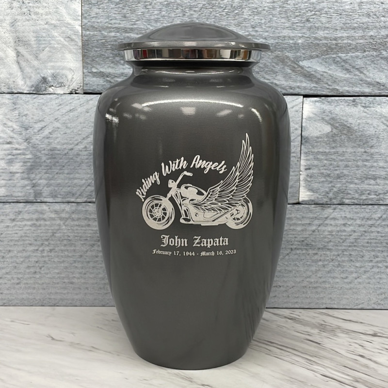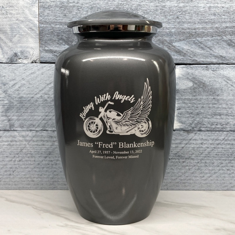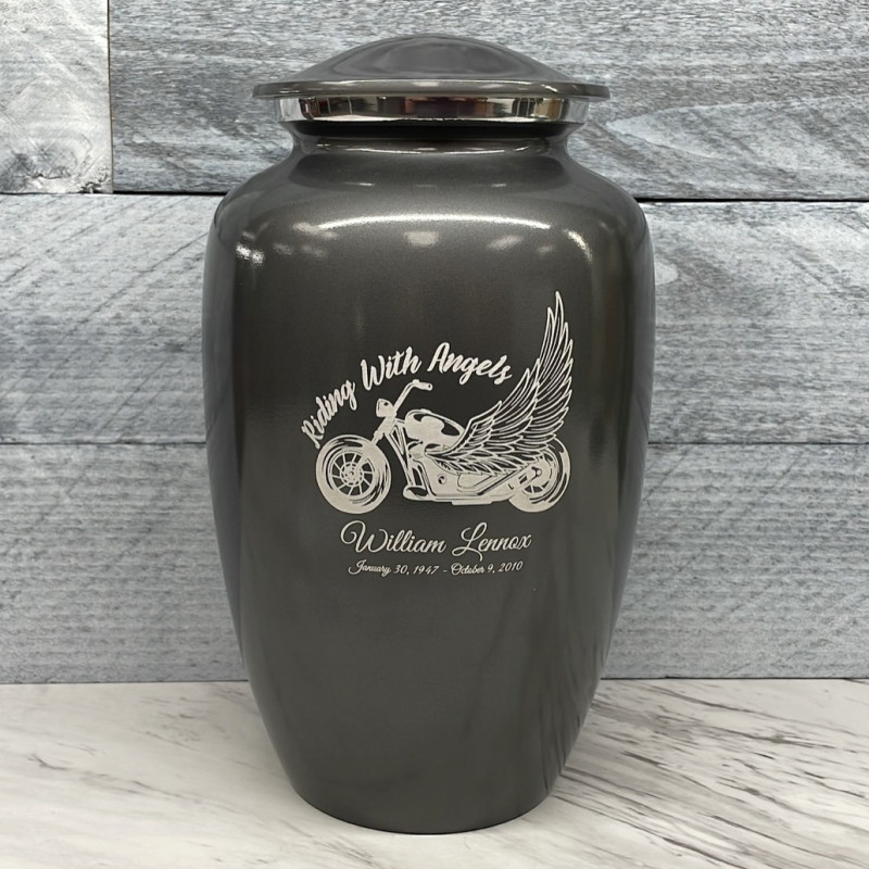 Choose an engraved Riding with Angels Motorcycle individual cremation urn to create a beautiful memorial that is sized to hold the entire remains of any adult. This adult sized urn is available in bold, attractive colors that offer sharp contrast with the engraved text and detailed artwork.