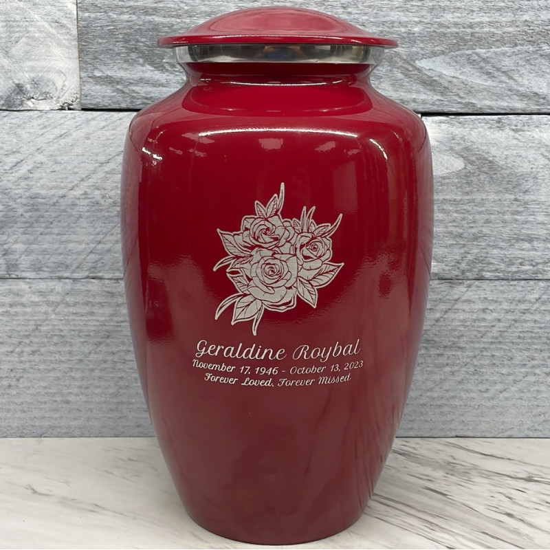 Choose a Rose Buds Cremation Urn to create a beautiful memorial that is sized to hold the entire remains of any adult. Bold, attractive colors offer sharp contrast with the engraved text and detailed artwork.