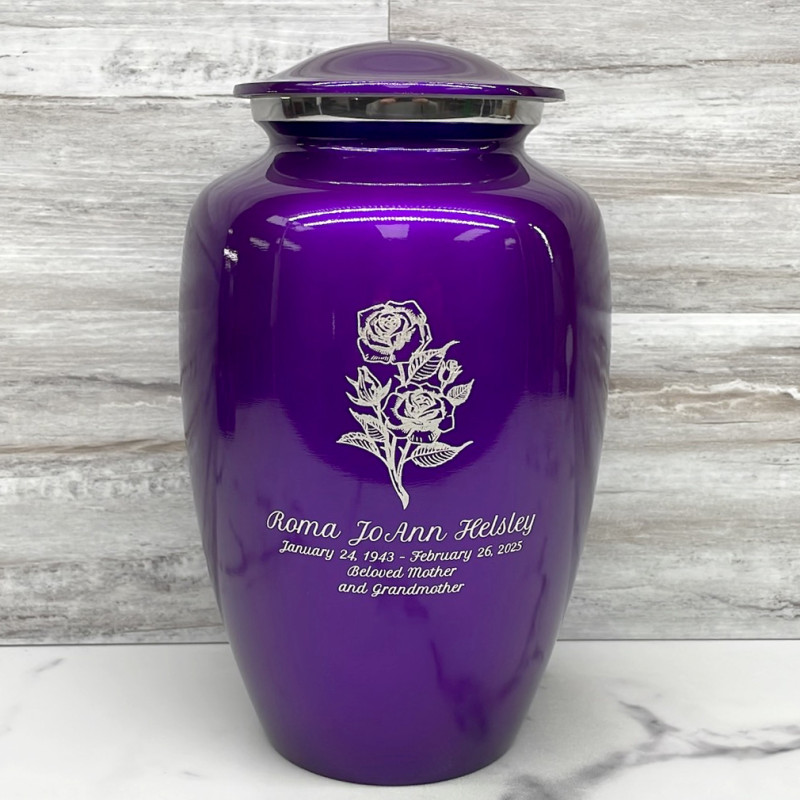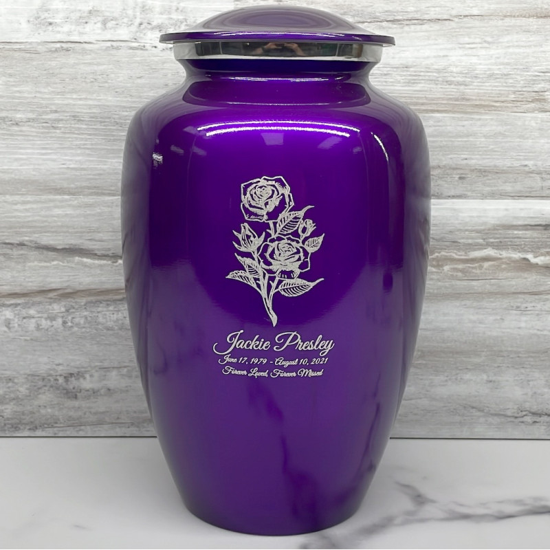 The rose is a timeless classic symbolizing love and beauty. Our Rose Cremation Urn with this purple luster finish is a reflection of elegance, and a beautiful way of expressing the qualities of your loved one that you hold close to your heart.