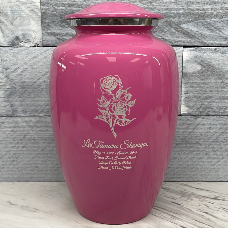Choose a Rose Cremation Urn to create a beautiful memorial that is sized to hold the entire remains of any adult. Bold, attractive colors offer sharp contrast with the engraved text and detailed artwork.