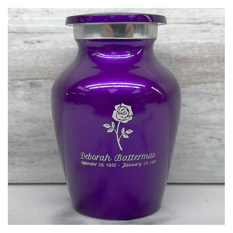 The Purple Luster Rose Keepsake Cremation Urn is a beautiful way to memorialize a loved one who is remembered with beauty and grace. Optional engraving that includes names, dates and up to three sentiment lines allows for this personal urn to become completely customized for you, your family or your beloved close friends.