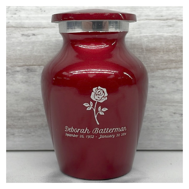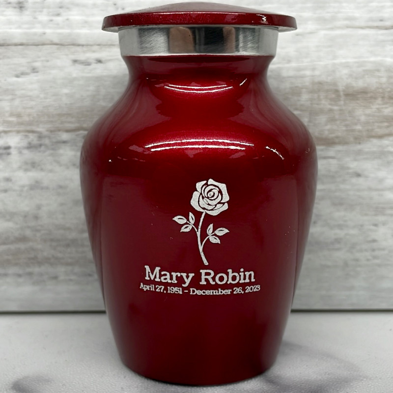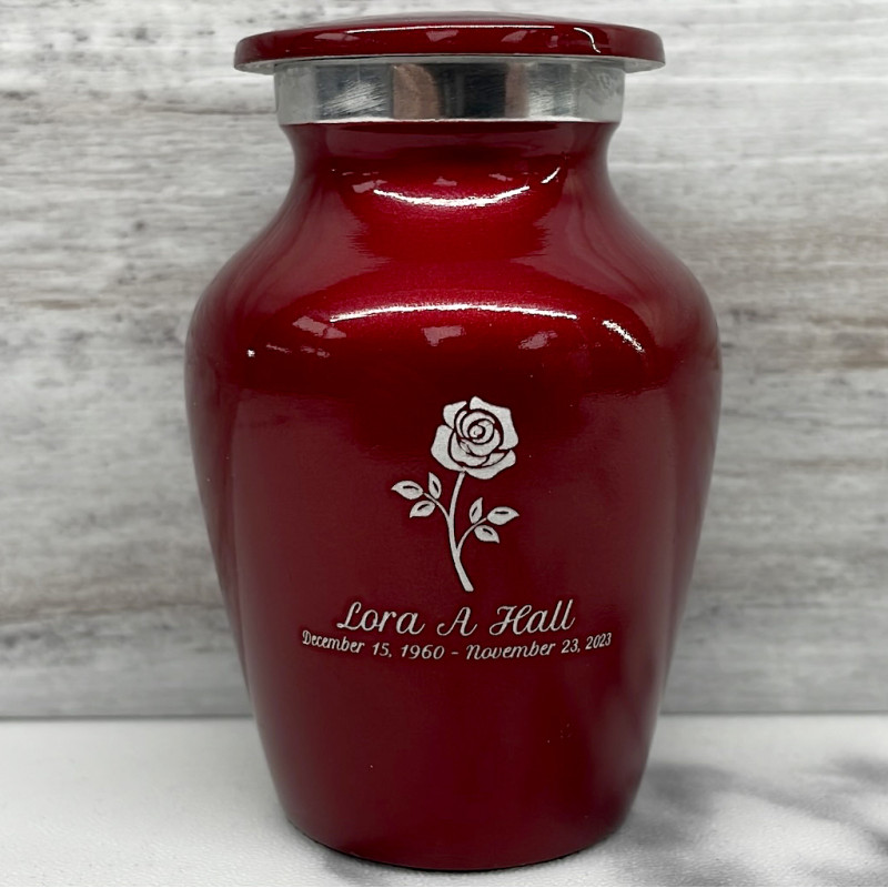 The Ruby Red Rose Keepsake Cremation Urn is a handsome personal memorial that features a detailed rose and optional additional engraving. The rose Ruby Red color combined with attractive rose artwork, along with optional custom engraving creates an unique keepsake for family members and close friends that can be treasured for years to come.