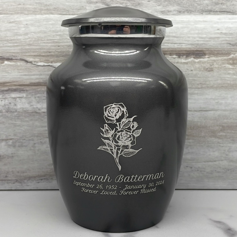 The Gunmetal Gray Rose Sharing Cremation Urn memorializes your loved one with a detailed engraving a beautiful rose. An outstanding value that allows everyone in the family to have a memorial of their own, optional engraving front and back there are many ways to make the urn unique to your loved one. A threaded lid and felt base ensure it securely closes and protects display surfaces.