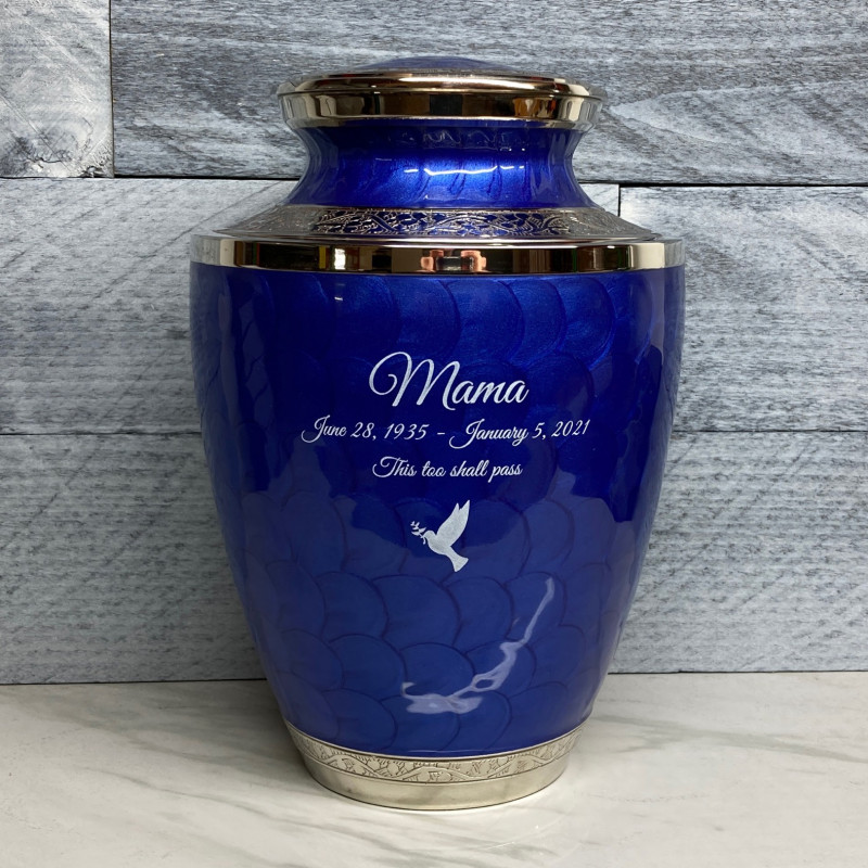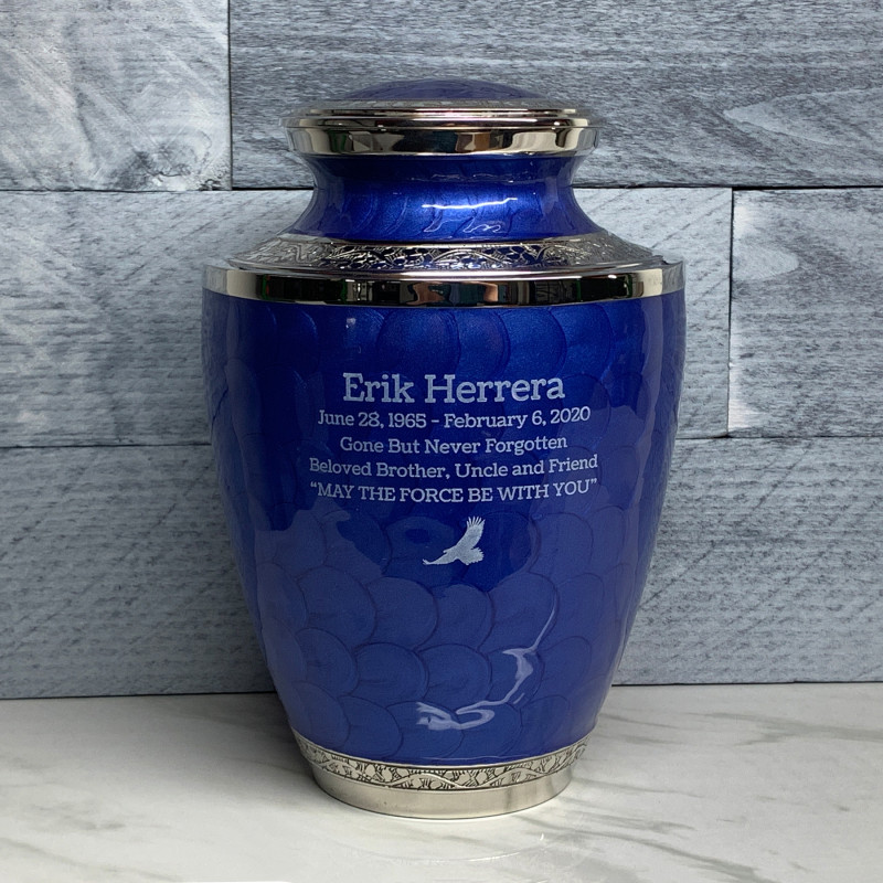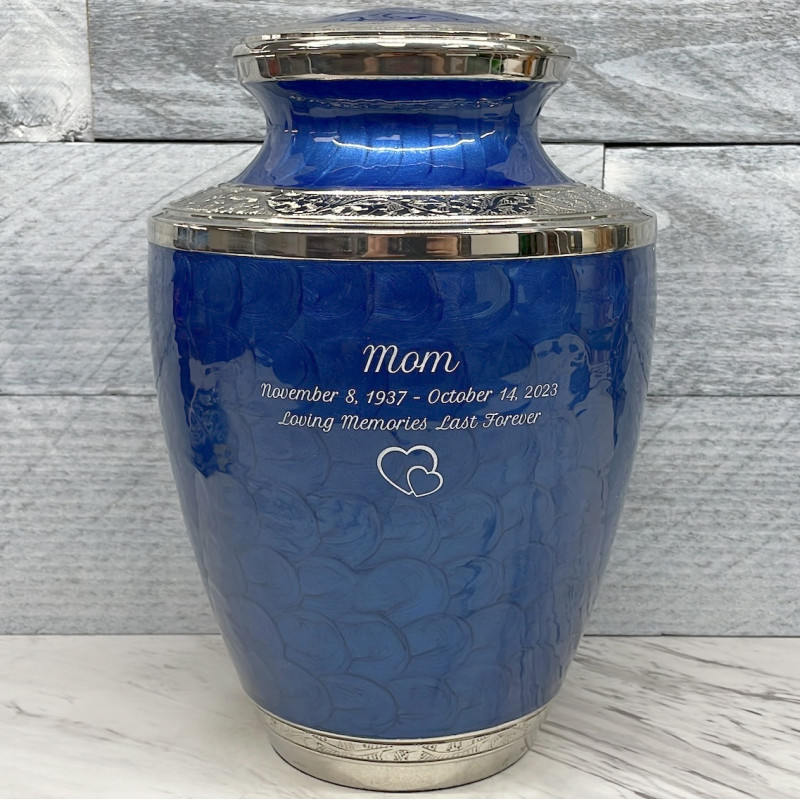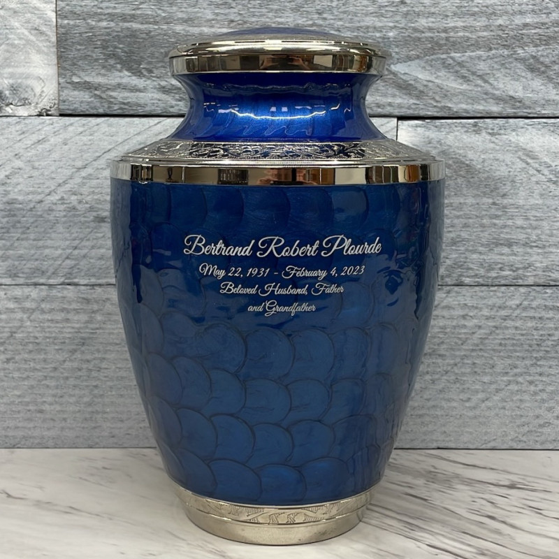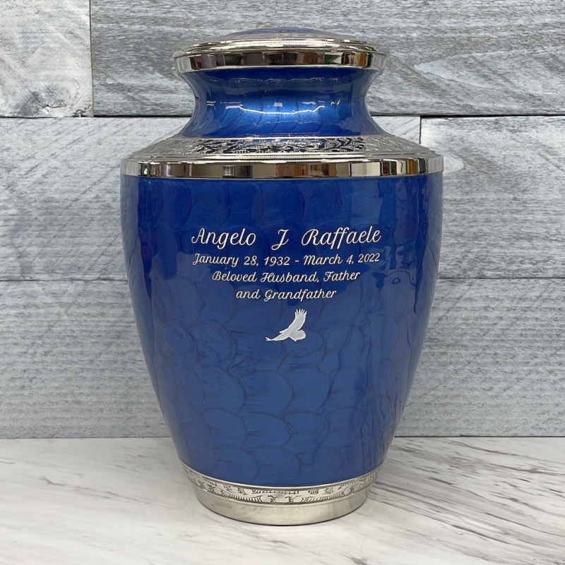 Our handmade Royal Blue Brass Cremation Urn is rich in color and detail. The fine etchings on the neck and lid along with the waves on its body give your loved one a handsome place to rest. This top of the line brass cremation urn has unmatched engraving options available exclusively at Green Meadow Memorials.