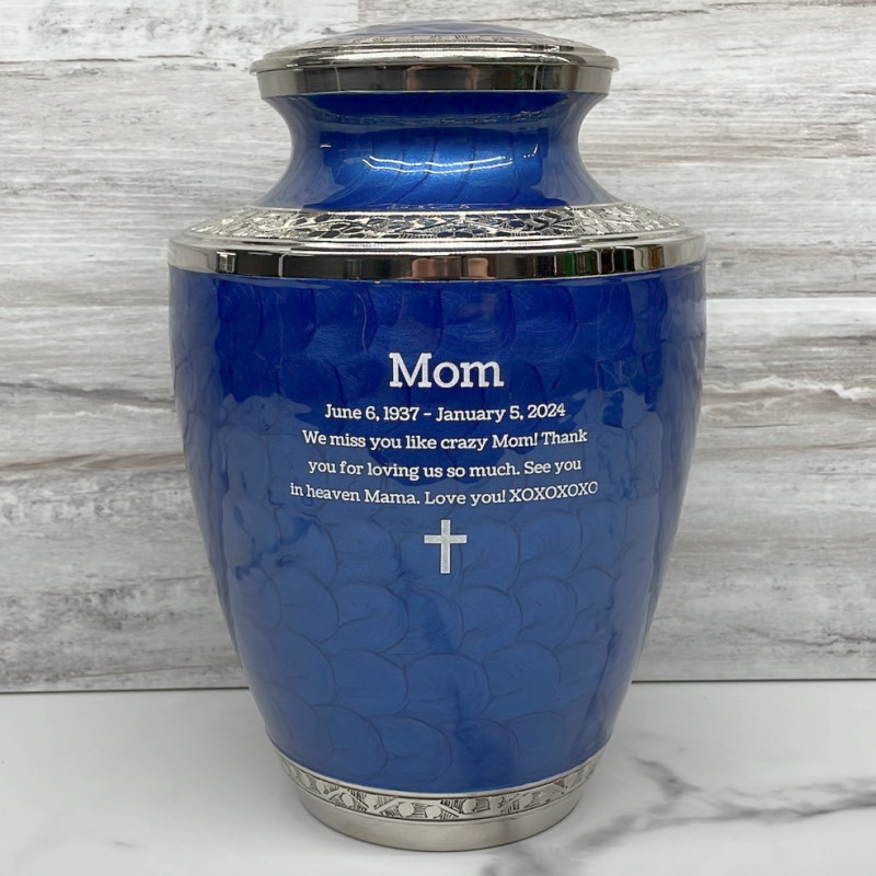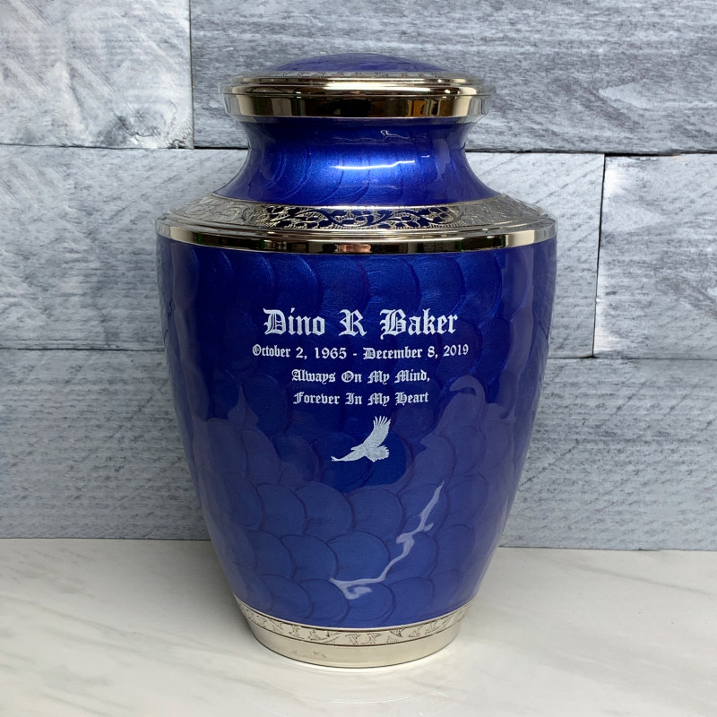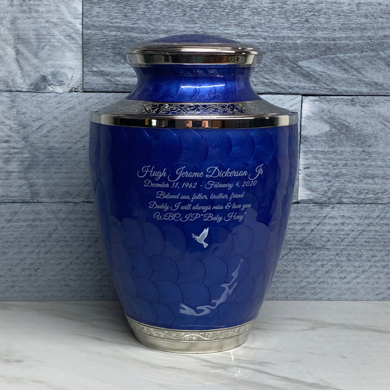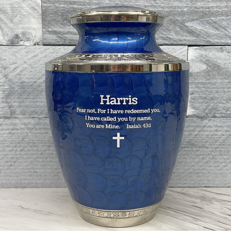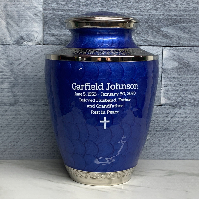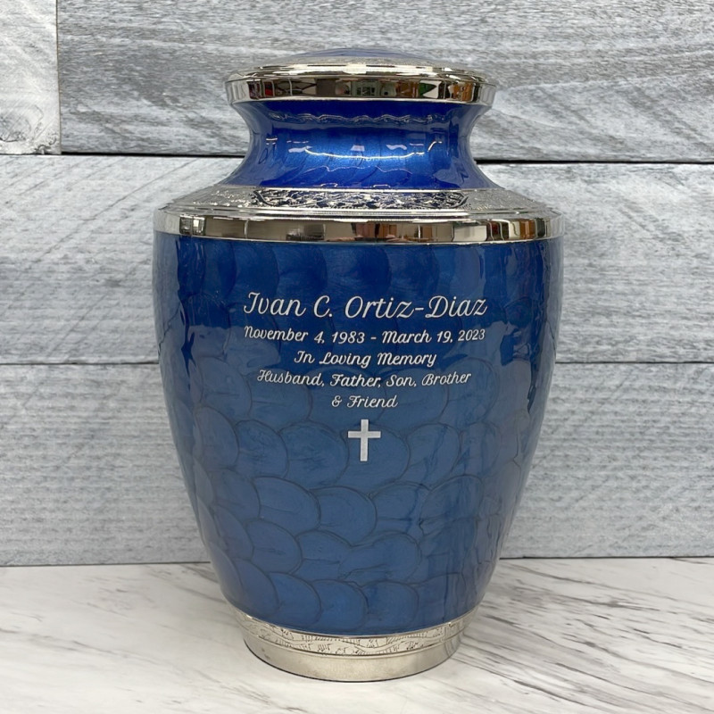 Our handmade Royal Blue Brass Cremation Urn is rich in color and detail. The fine etchings on the neck and lid along with the waves on its body give your loved one a handsome place to rest. This top of the line brass cremation urn has unmatched engraving options available exclusively at Green Meadow Memorials.