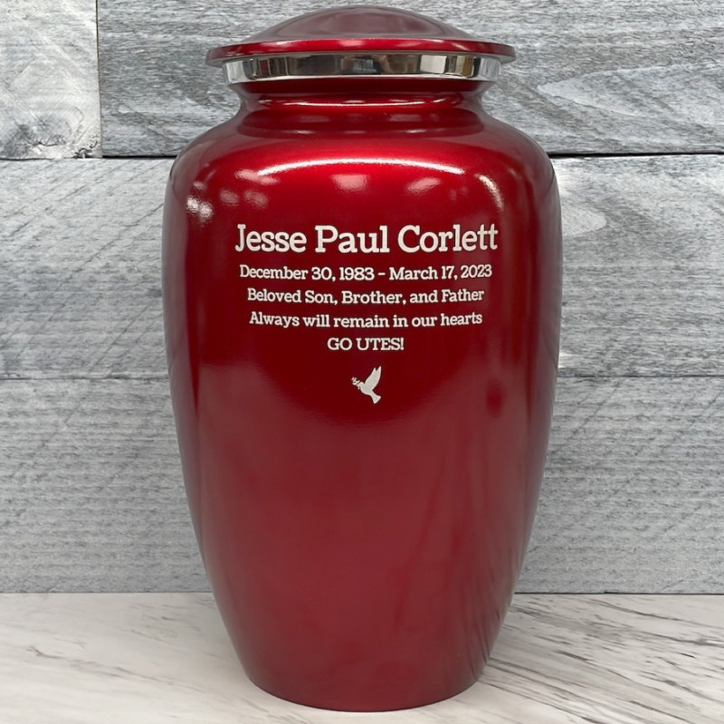 The Ruby Red Cremation Urn features a beautiful deep red finish inspired by fast and attractive sports cars. Optional engraving includes name and date lines, up to three sentiment lines and a choice of nine small artwork options. The back of the urn can also be engraved with available poems or custom text.