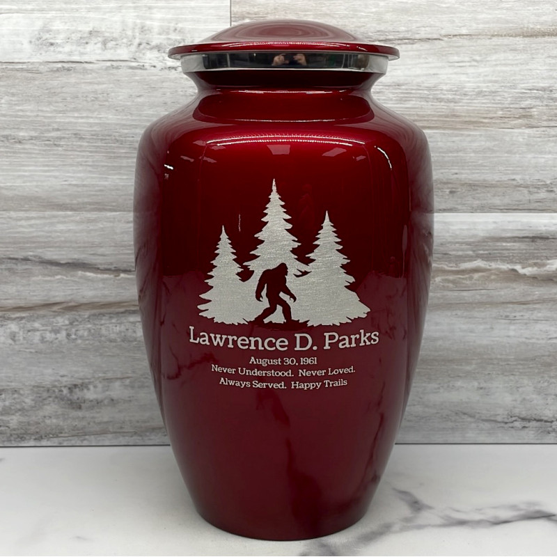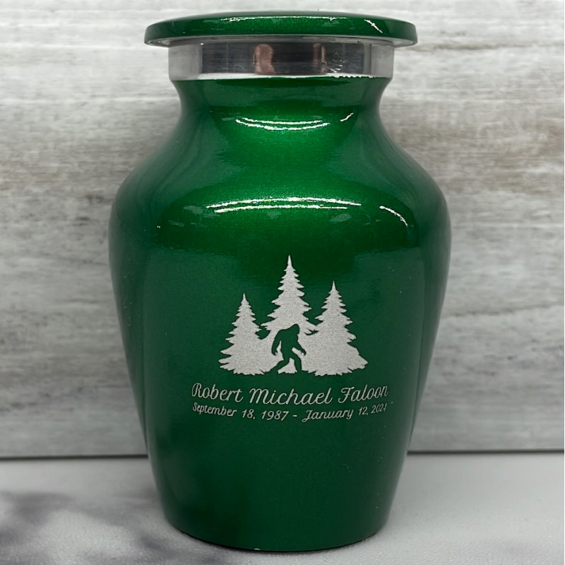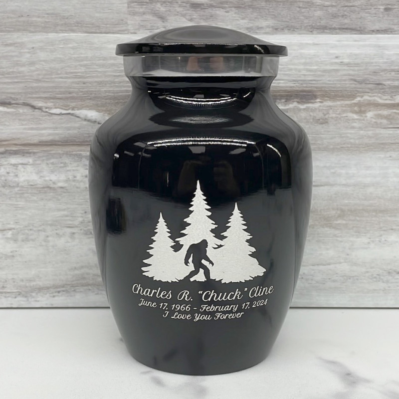 Select a Sasquatch Sharing Urn to create a personal memorial that is a step larger than a keepsake urn but more petite than a full size urn. Bold, attractive colors offer sharp contrast with the engraved text and detailed artwork.