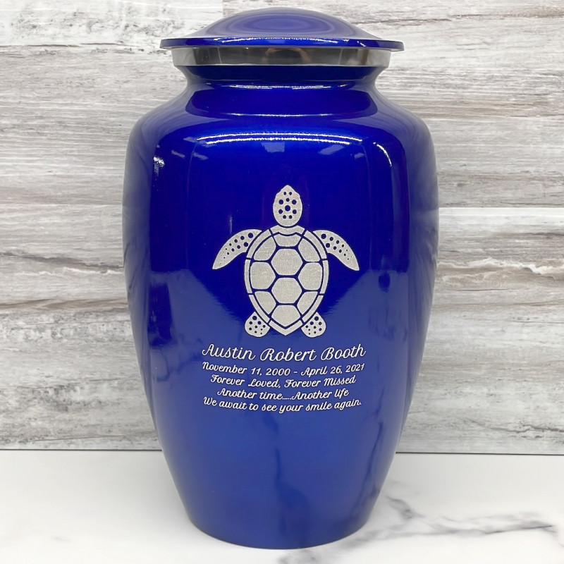 The Midnight Blue Sea Turtle Cremation Urn is a handsome way to keep the memories of a loved one close. A detailed Sea Turtle along with optional engraving that includes a name line, date line and three lines for sentiments allows for the creation of completely custom memorial.