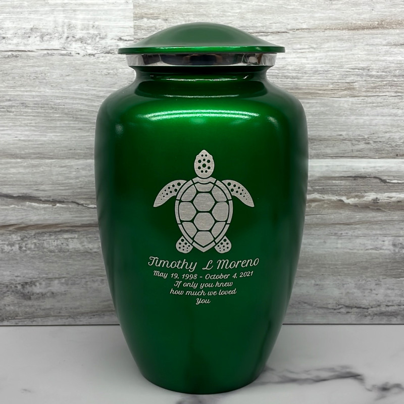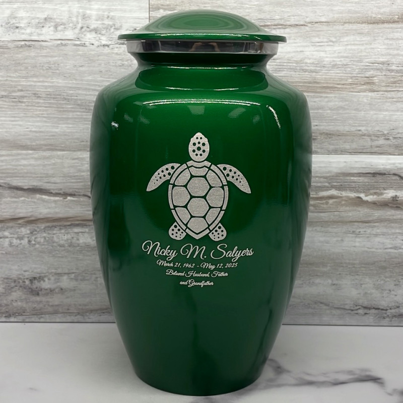 The Shamrock Green Sea Turtle Cremation Urn is a handsome way to keep the memories of a loved one close. A detailed Sea Turtle along with optional engraving that includes a name line, date line and three lines for sentiments allows for the creation of completely custom cremation memorial.