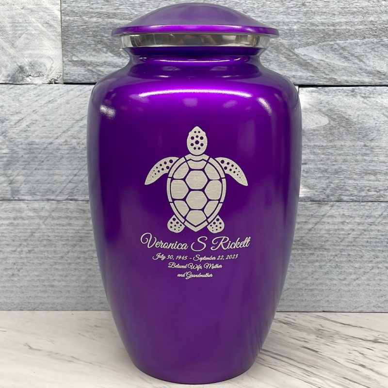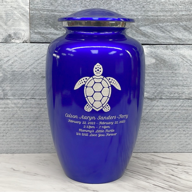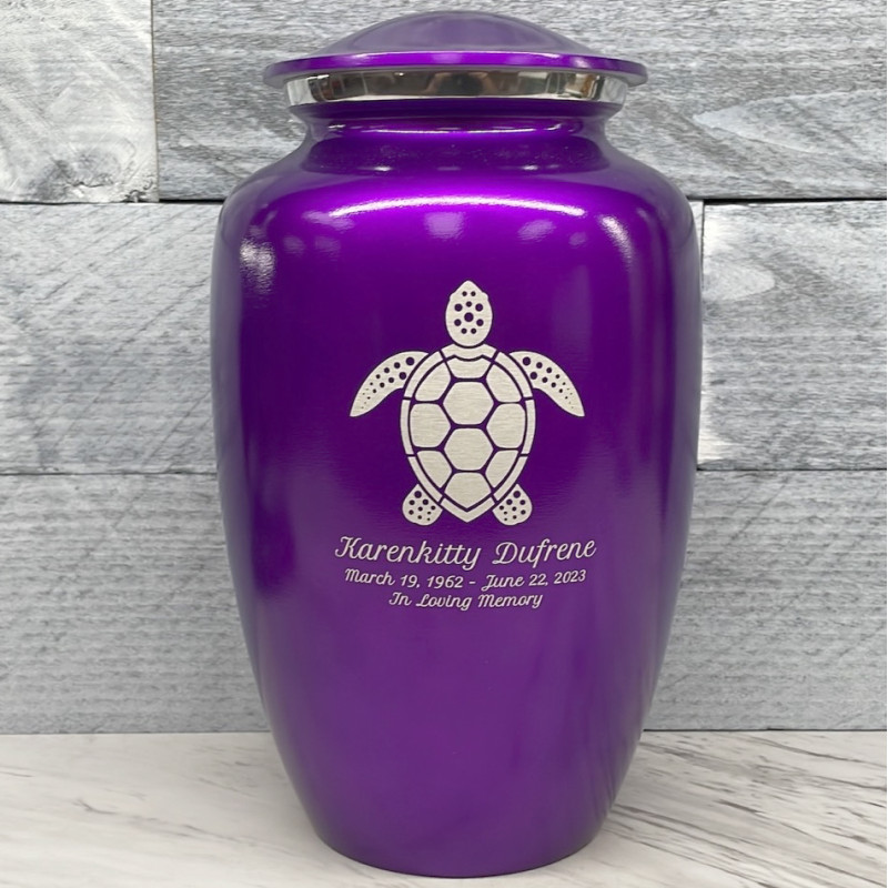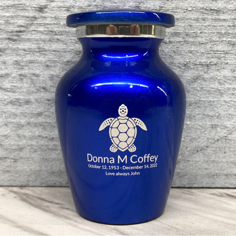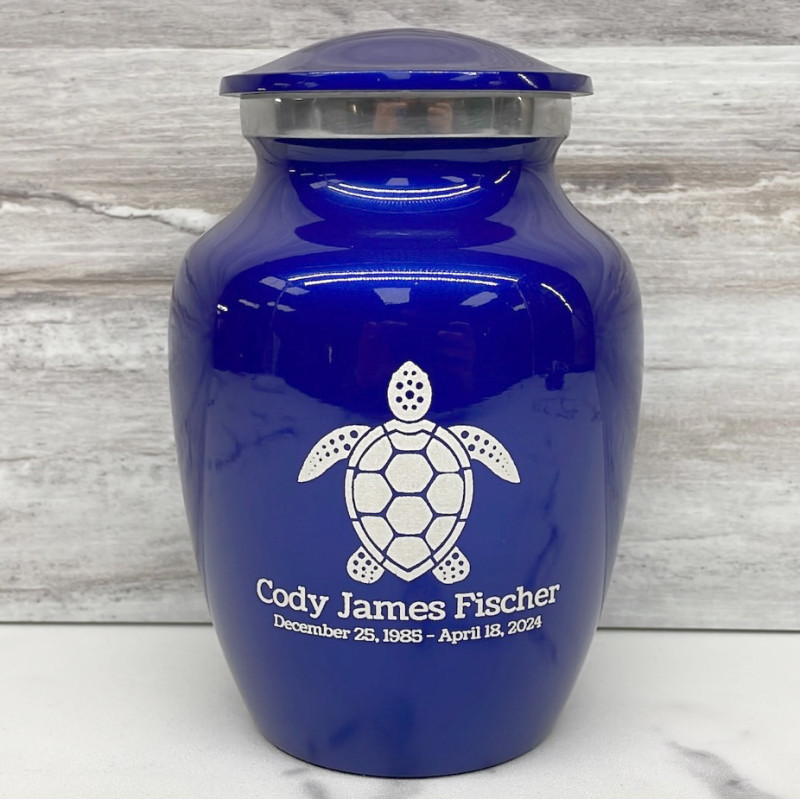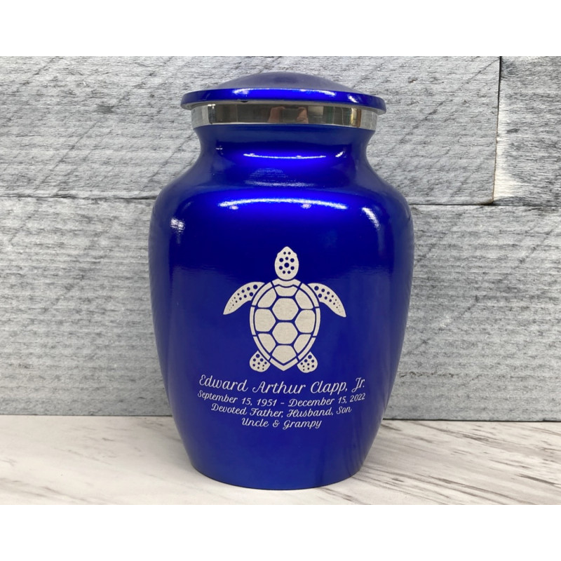 The Midnight Blue Sea Turtle Sharing Cremation Urn features a handsome sea turtle engraving. It's an outstanding value that allows everyone in the family to have a memorial of their own. Optional engraving front and back there are many ways to make the urn unique to your loved one. A threaded lid and felt base ensure it securely closes and protects display surfaces.