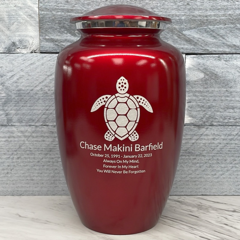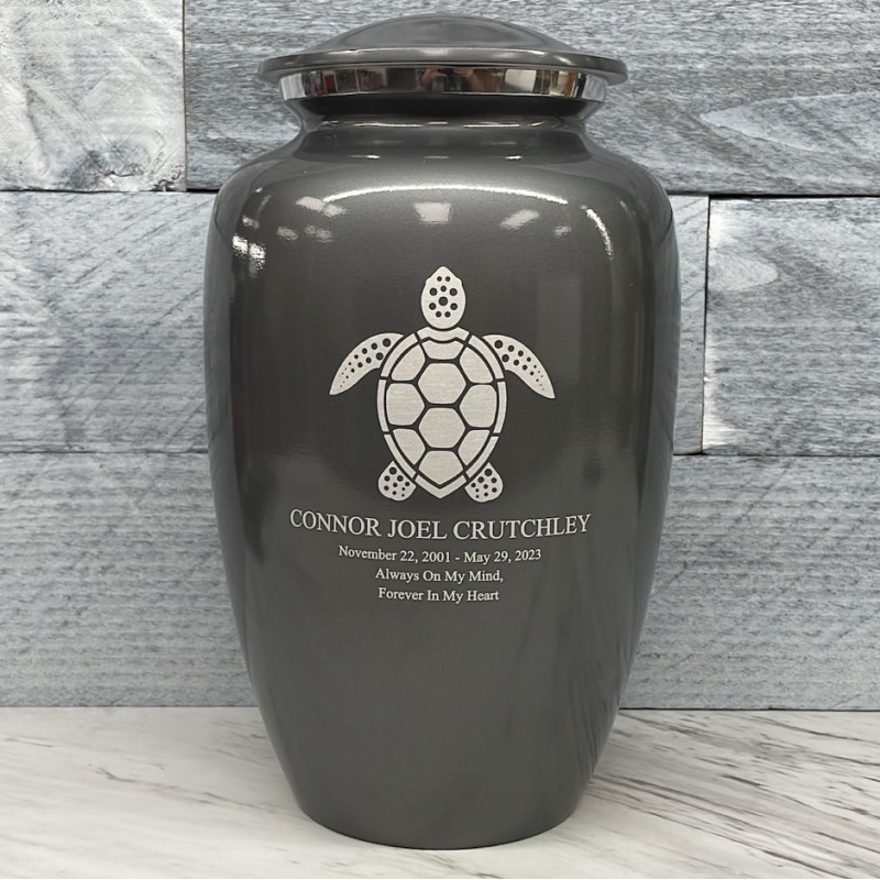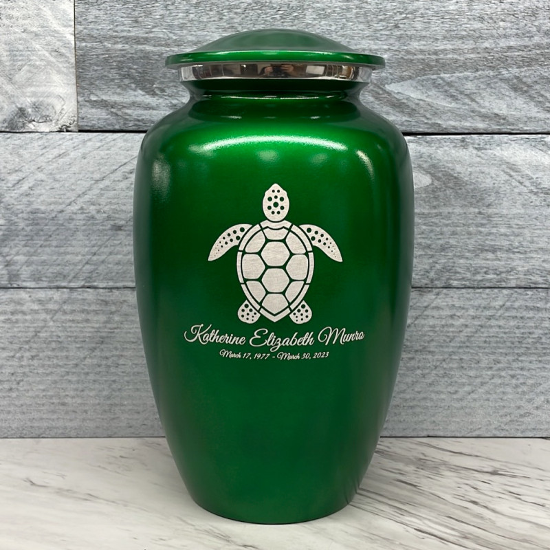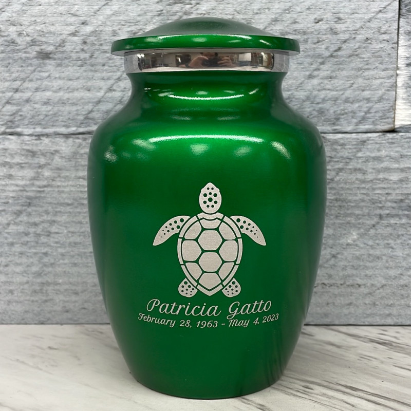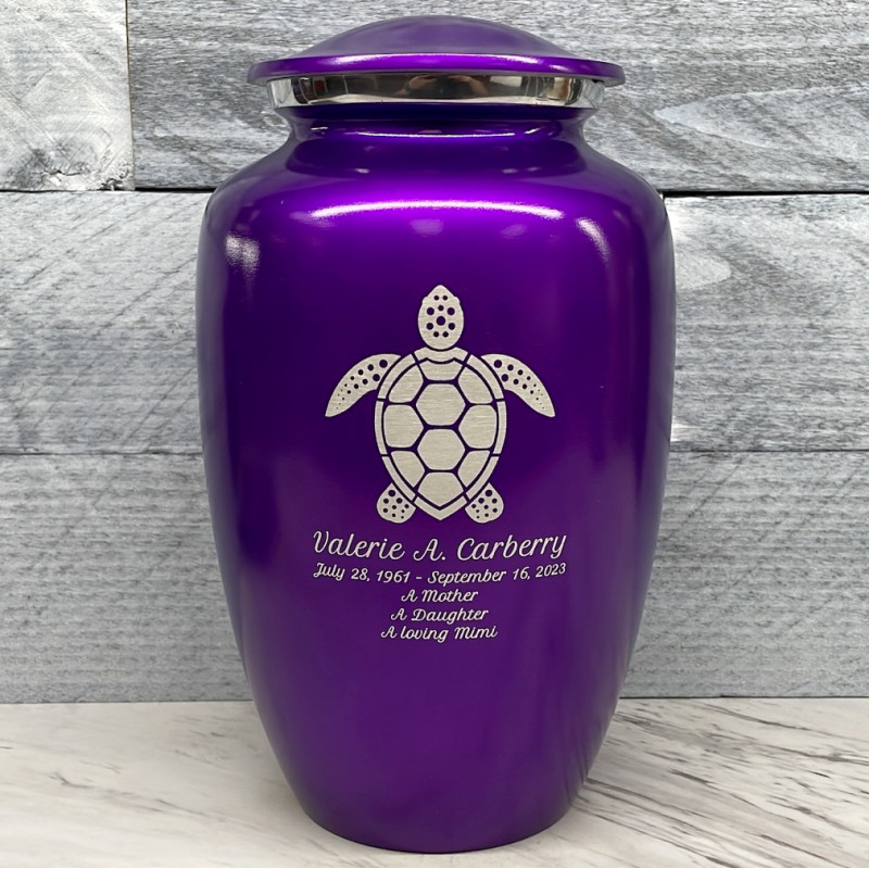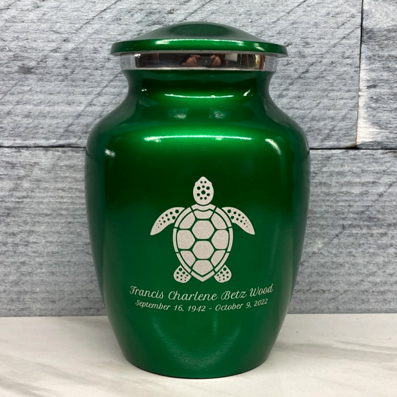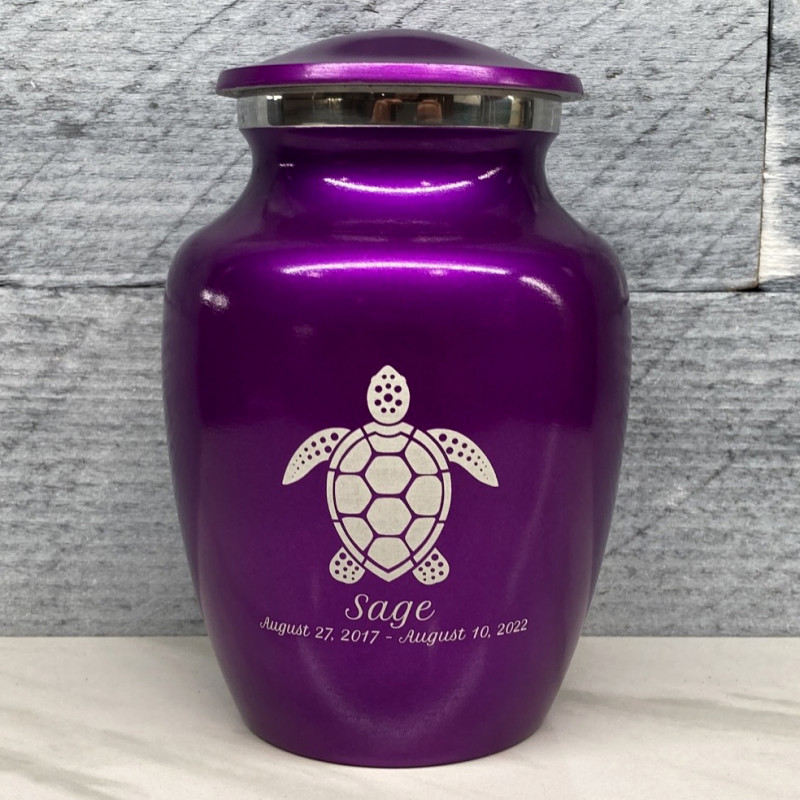 The Midnight Blue Sea Turtle Sharing Cremation Urn features a handsome sea turtle engraving. It's an outstanding value that allows everyone in the family to have a memorial of their own. Optional engraving front and back there are many ways to make the urn unique to your loved one. A threaded lid and felt base ensure it securely closes and protects display surfaces.