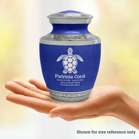 Select Sea Turtle Sharing Urn - Royal Blue to create a personal memorial that is a step larger than a keepsake urn but more petite than a full size urn. Bold, attractive colors offer sharp contrast with the engraved text and detailed artwork.