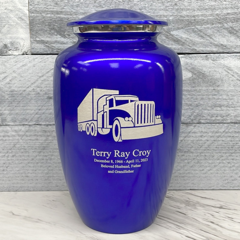 Choose this Midnight Blue Semi Truck Cremation Urn for your loved one today.