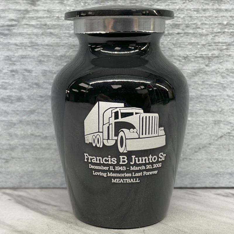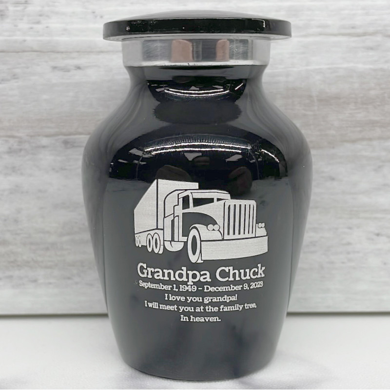Choose a Semi Truck Keepsake Urn to create an intimate and personal memorial for family members or close friends. Bold, attractive colors offer sharp contrast with the engraved text and artwork.