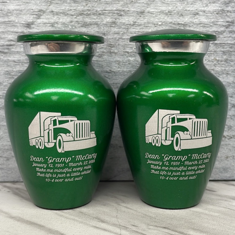 The Shamrock Green Semi Truck Keepsake Cremation Urn is a handsome way to keep the memories of dedicated trucker close. A remarkably detailed semi truck along with optional engraving that includes a name line, date line and three lines for sentiments allows for the creation of completely custom personal memorials for yourself, family or close friends.