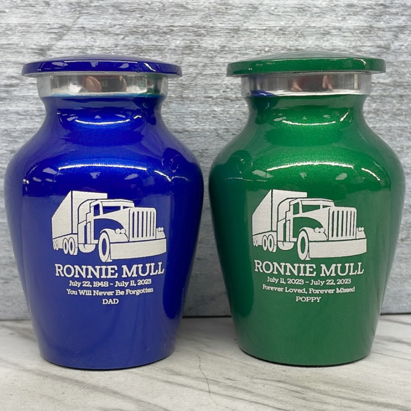 Semi Truck Keepsake Urn - Midnight Blue Semi Truck Keepsake Urn - Gunmetal Gray Semi Truck Keepsake Urn - Purple LusterSizes