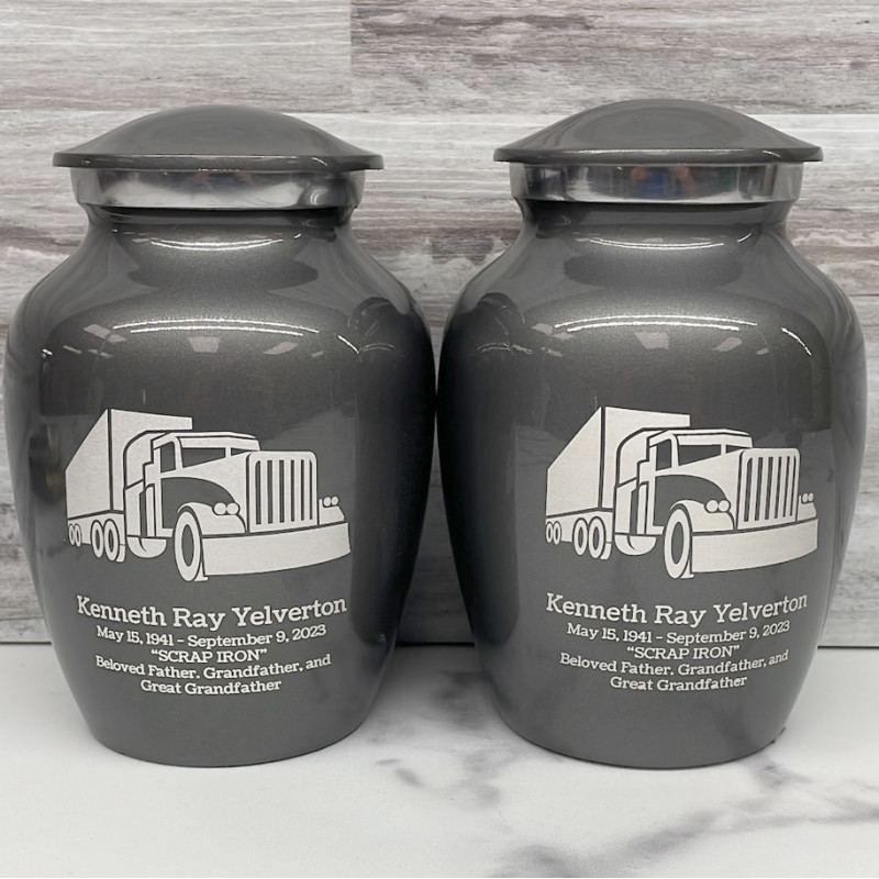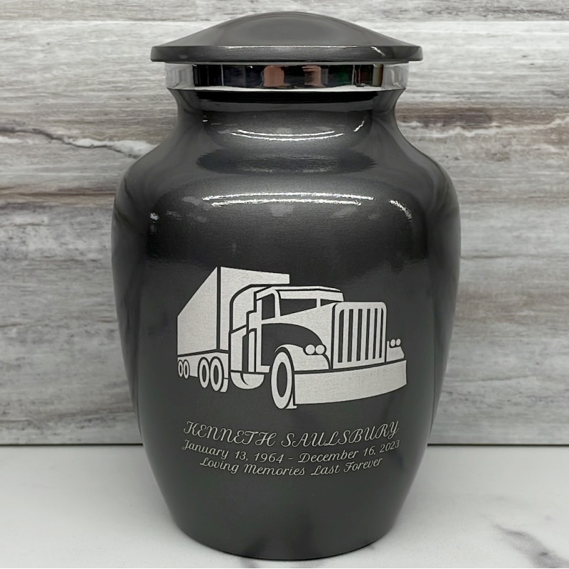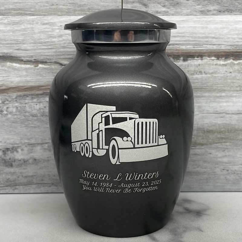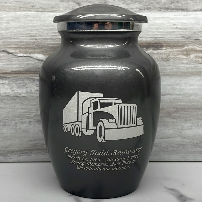 Remember your dedicated trucker with the Gunmetal Gray Semi Truck Sharing Cremation urn. It's an outstanding value that allows everyone in the family to have a memorial of their own. Optional engraving front and back there are many ways to make the urn unique to your loved one. A threaded lid and felt base ensure it securely closes and protects display surfaces.