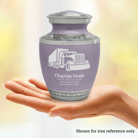 Select Semi Truck Sharing Urn - Regal Purple to create a personal memorial that is a step larger than a keepsake urn but more petite than a full size urn. Bold, attractive colors offer sharp contrast with the engraved text and detailed artwork.