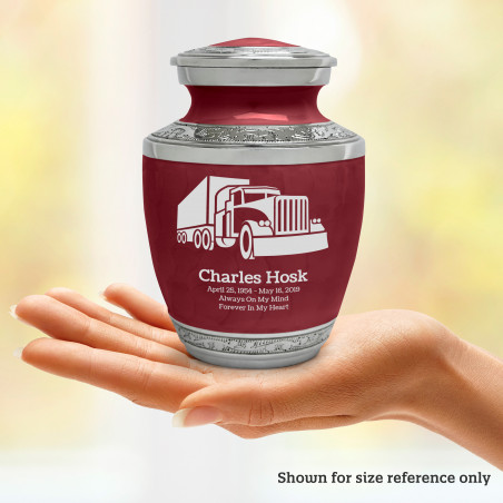 Select Semi Truck Sharing Urn - Rose Red to create a personal memorial that is a step larger than a keepsake urn but more petite than a full size urn. Bold, attractive colors offer sharp contrast with the engraved text and detailed artwork.