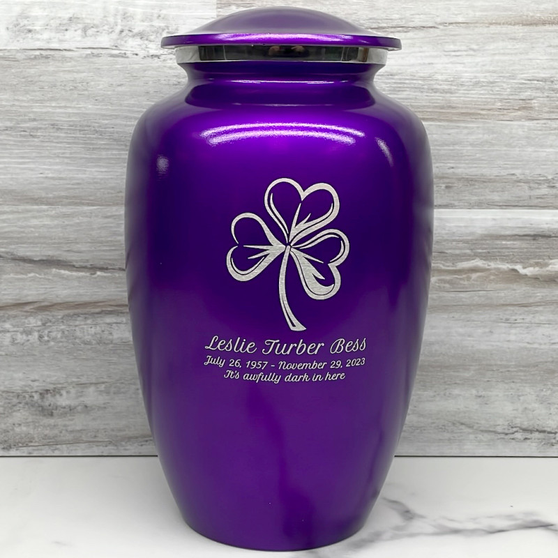 Choose this Shamrock Cremation Urn in our Purple Luster finish to receive an attractive memorial that is engraved with beautiful artwork and optionally a name, dates and multiple sentiment lines. The back of the urn is a canvas that is available as well, with choices from our most popular poems and bible verses or your own custom text.