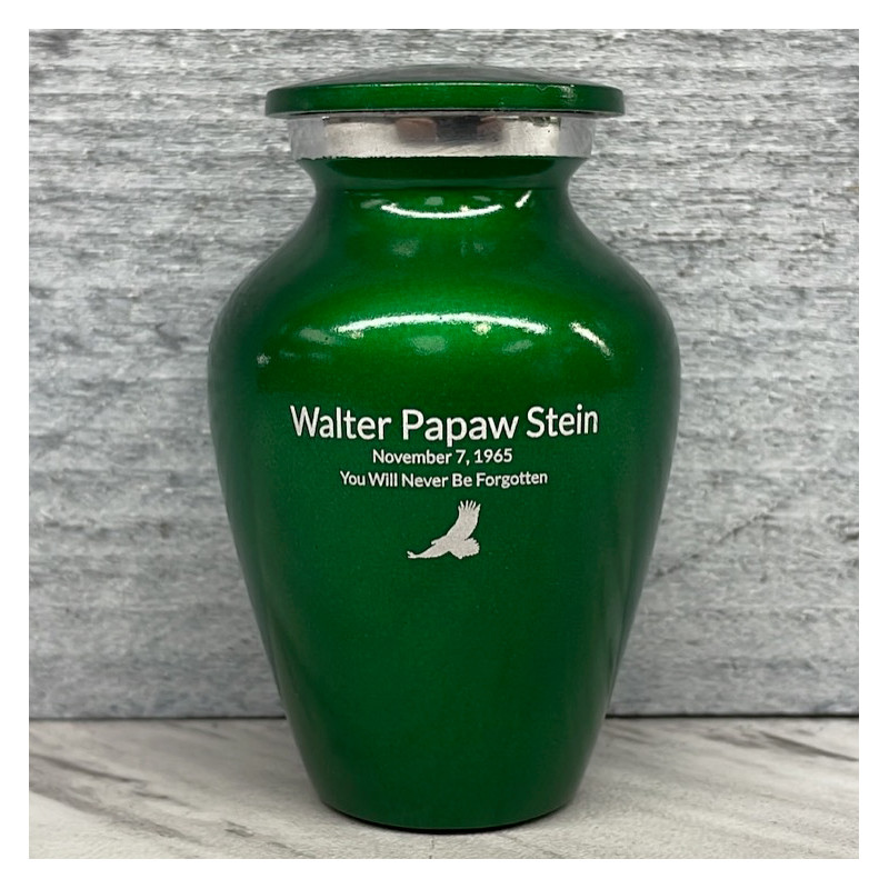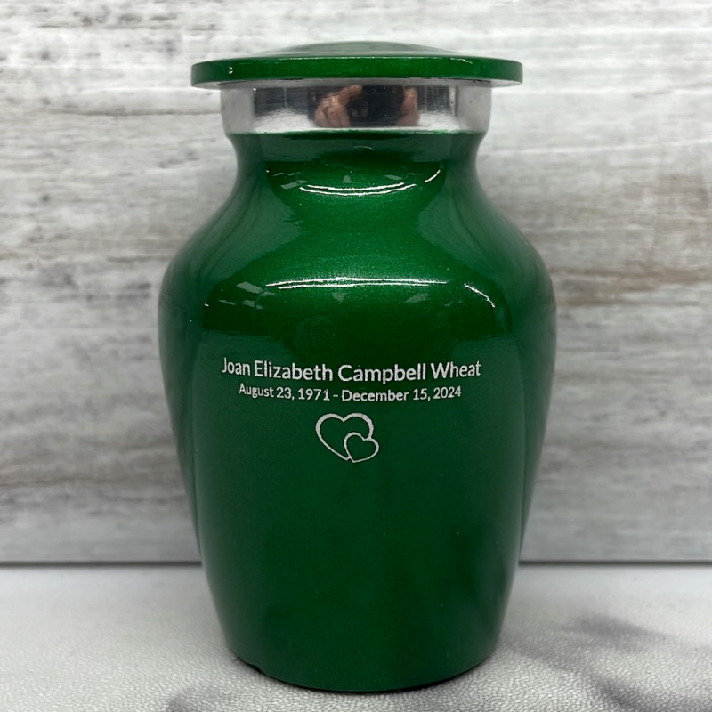A small vessel symbolizing renewal, growth, and love can be held near or shared with others. This green keepsake cremation urn is perfect for your loved one.