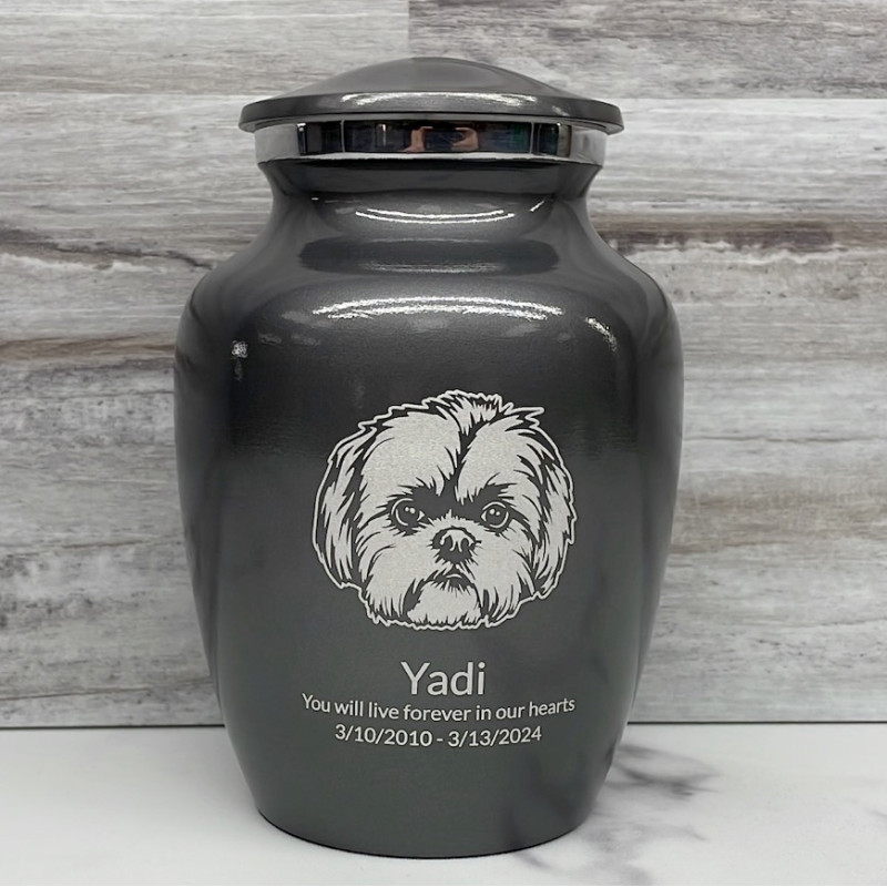The Small Gunmetal Gray Shih Tzu Pet Cremation Urn is an attractive and meaningful way to pay tribute to your pet who has passed on. Optional engraving features a name line and two additional lines that can include dates or sentiment lines. Choose from our most popular sentiments, customize them or enter your own text to make it completely unique.