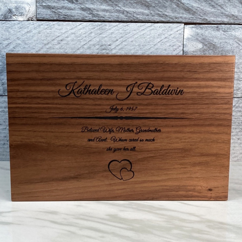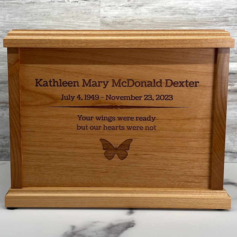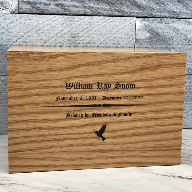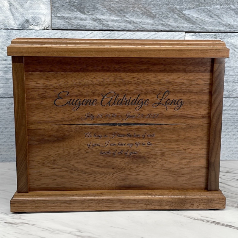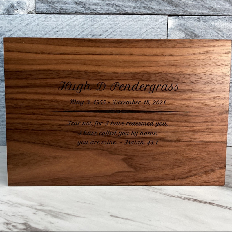 We chose the alder wood urn and customized it with my uncles information. The craftsmanship of this urn goes above and beyond, we were so pleased with the final product! The wood was beautiful and custom lettering was excellent as well. A very nice choice for my beloved uncle.