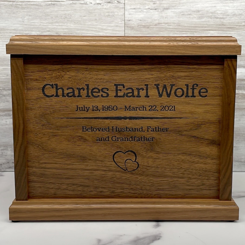 This made in the USA solid walnut wood urn is custom built for Green Meadow Memorials to meet our demanding specifications for a beautiful, high quality hardwood urn. The solid walnut has an attractive natural color that is timeless and works well with our direct laser engraving process.