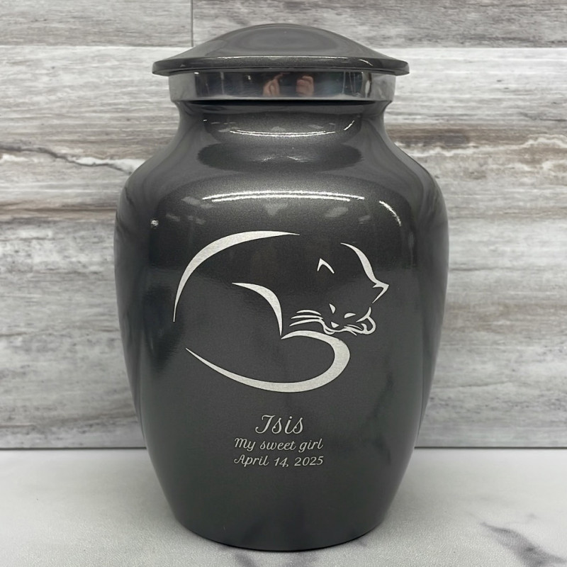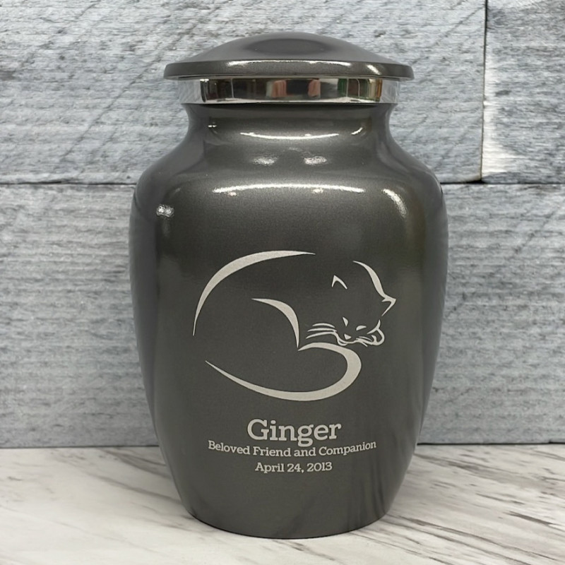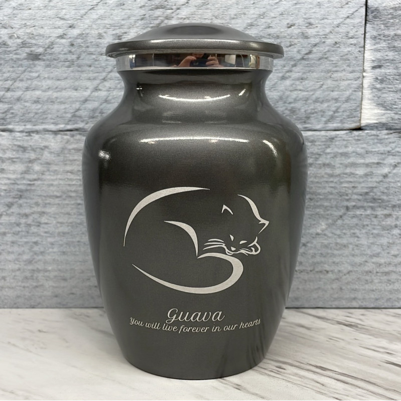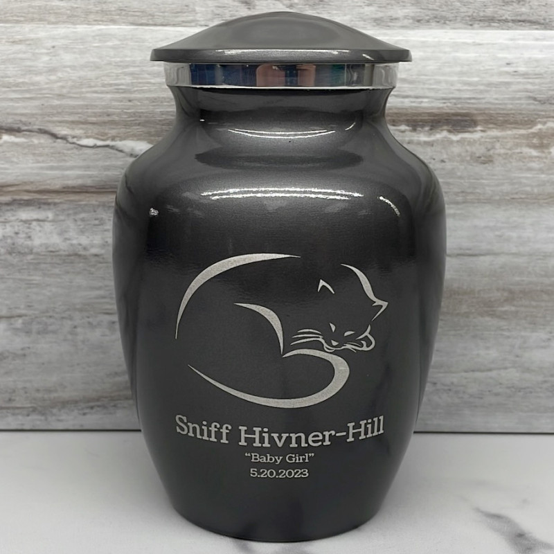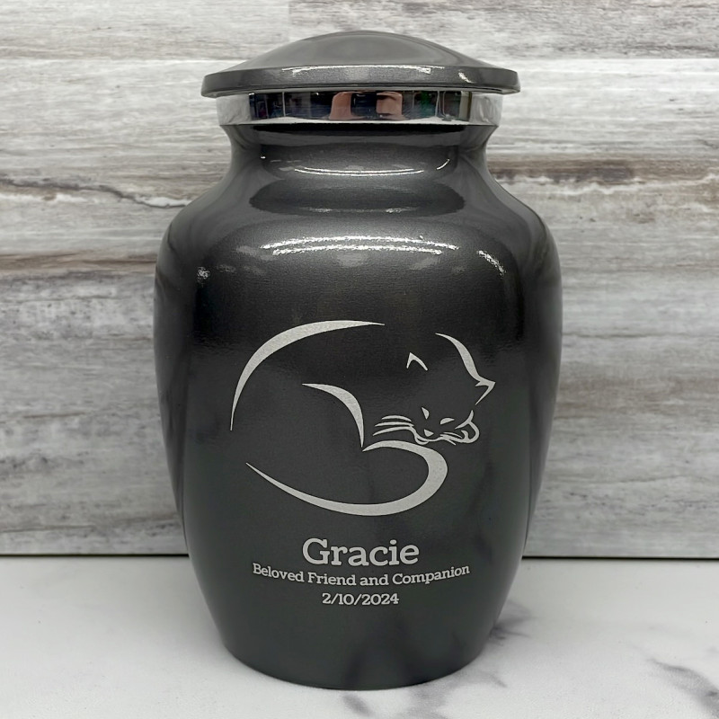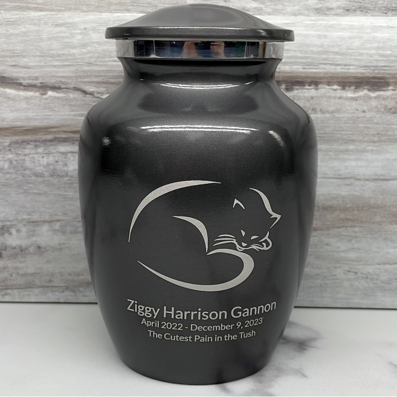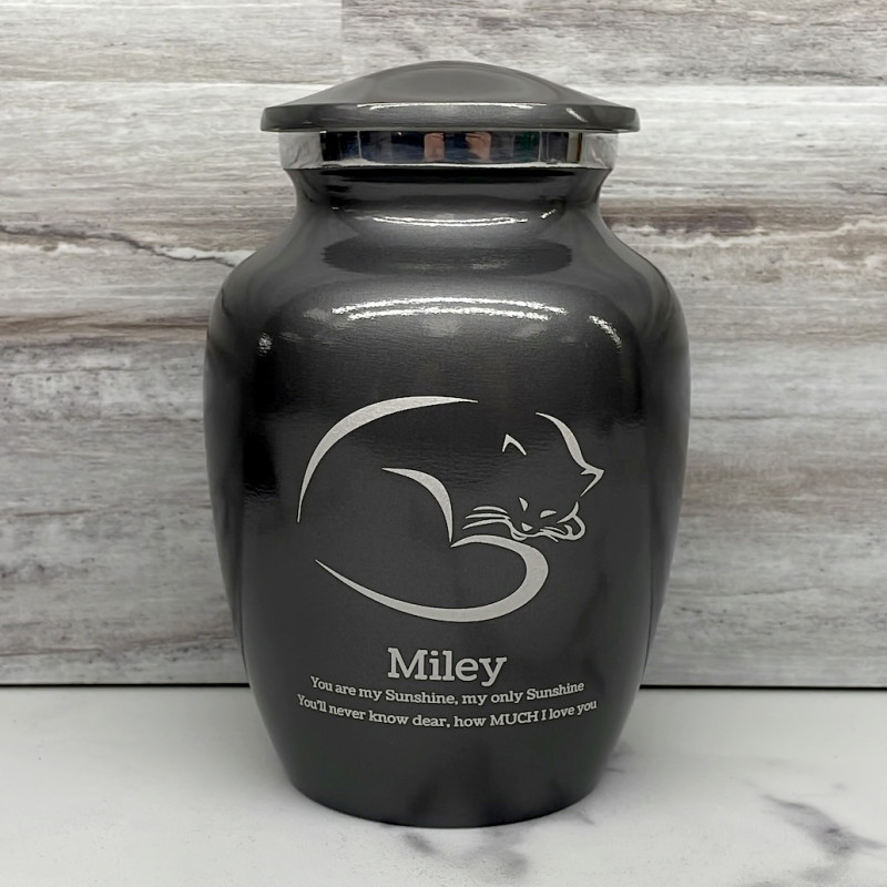 The Small Gunmetal Gray Sleeping Cat Pet Cremation Urn is an attractive and meaningful way to pay tribute to your cat who has passed on. Optional engraving features a name line and two additional lines that can include dates or sentiment lines. Choose from our most popular sentiments, customize them or enter your own text to make it completely unique.
