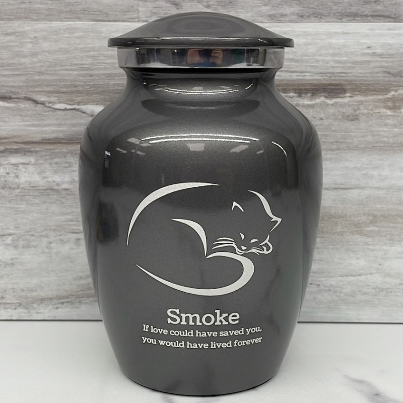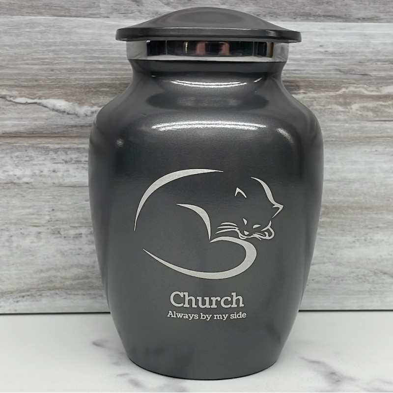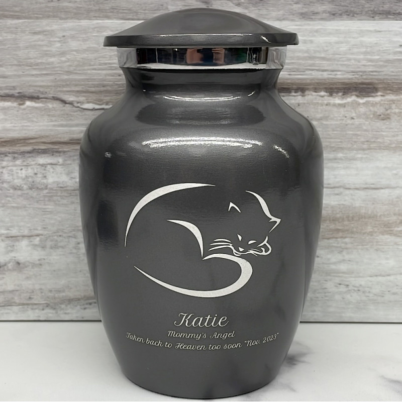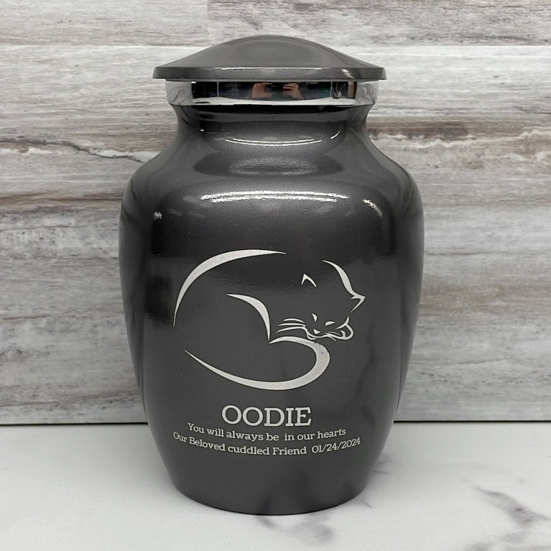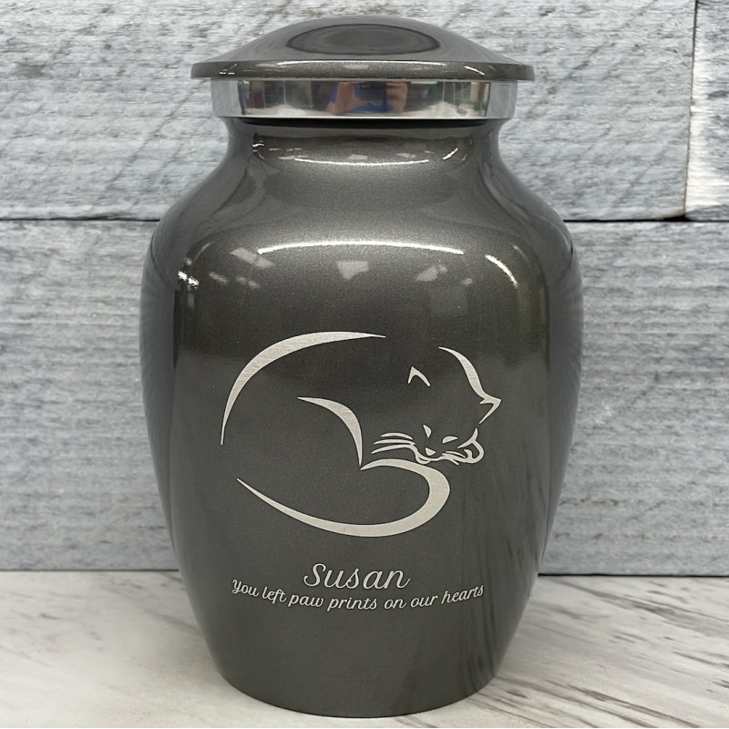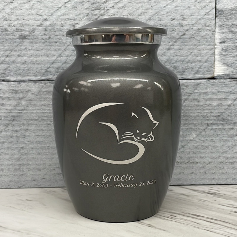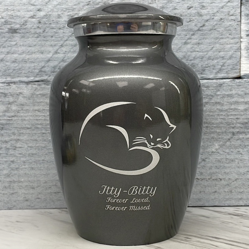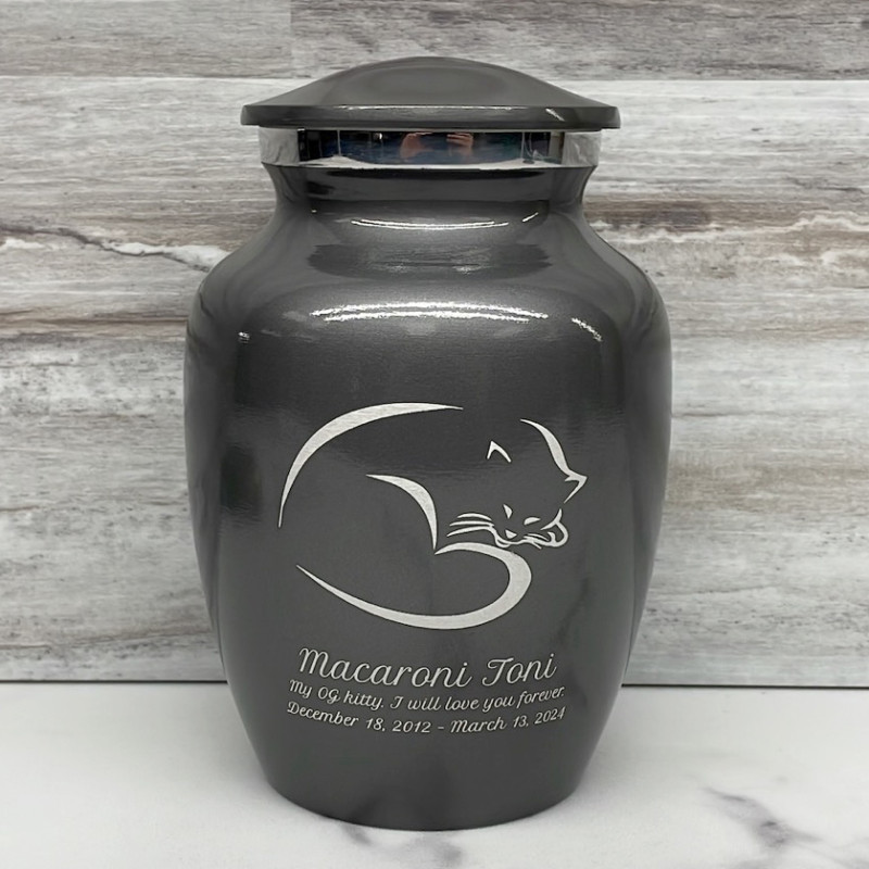 The Small Gunmetal Gray Sleeping Cat Pet Cremation Urn is an attractive and meaningful way to pay tribute to your cat who has passed on. Optional engraving features a name line and two additional lines that can include dates or sentiment lines. Choose from our most popular sentiments, customize them or enter your own text to make it completely unique.
