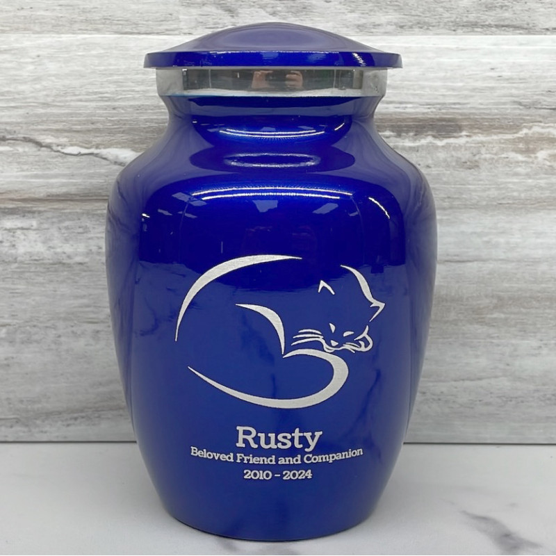 The Small Midnight Blue Sleeping Cat Pet Cremation Urn is an attractive and meaningful way to pay tribute to your pet who has passed on. Optional engraving features a name line and two additional lines that can include dates or sentiment lines. Choose from our most popular sentiments, customize them or enter your own text to make it completely unique.