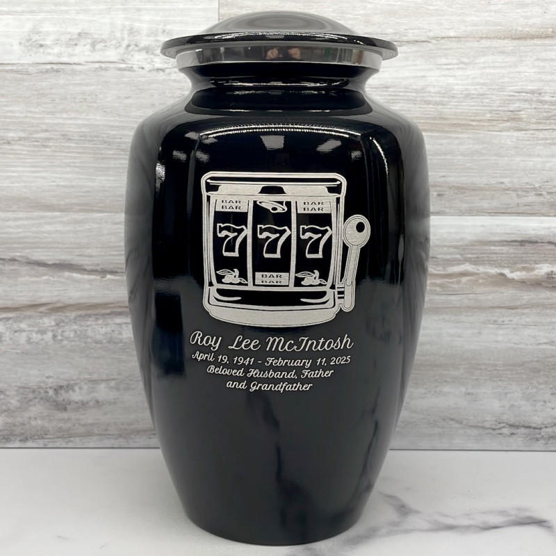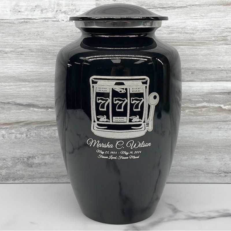 Choose a Slot Machine Cremation Urn to create a beautiful memorial that is sized to hold the entire remains of any adult. Bold, attractive colors offer sharp contrast with the engraved text and detailed artwork.