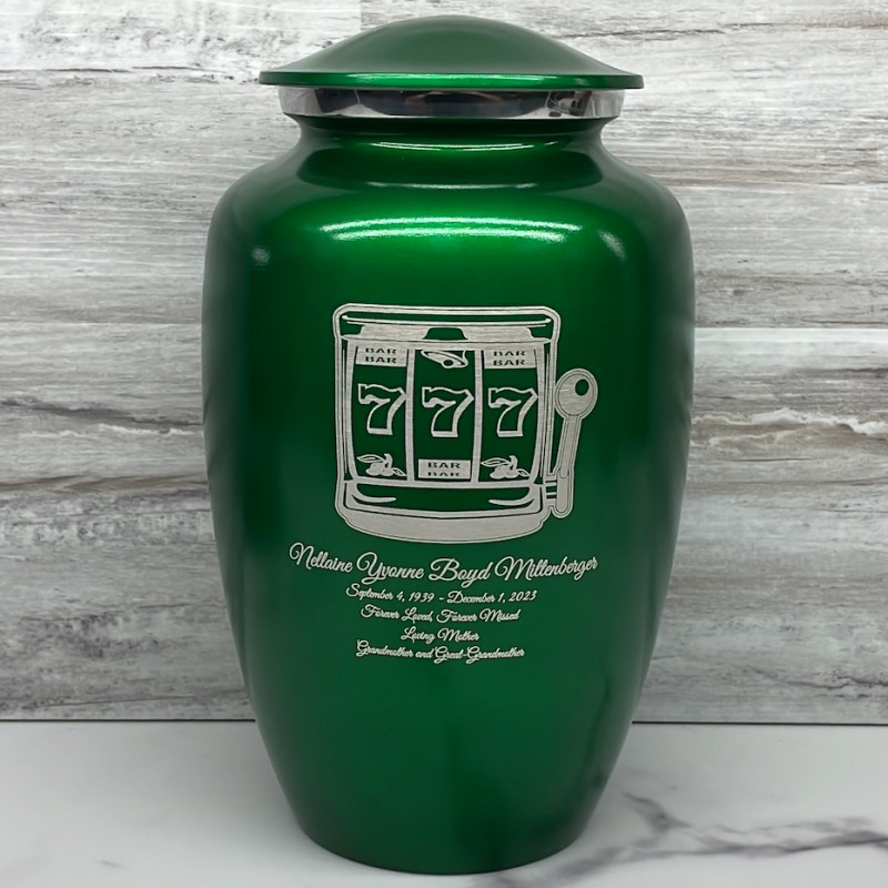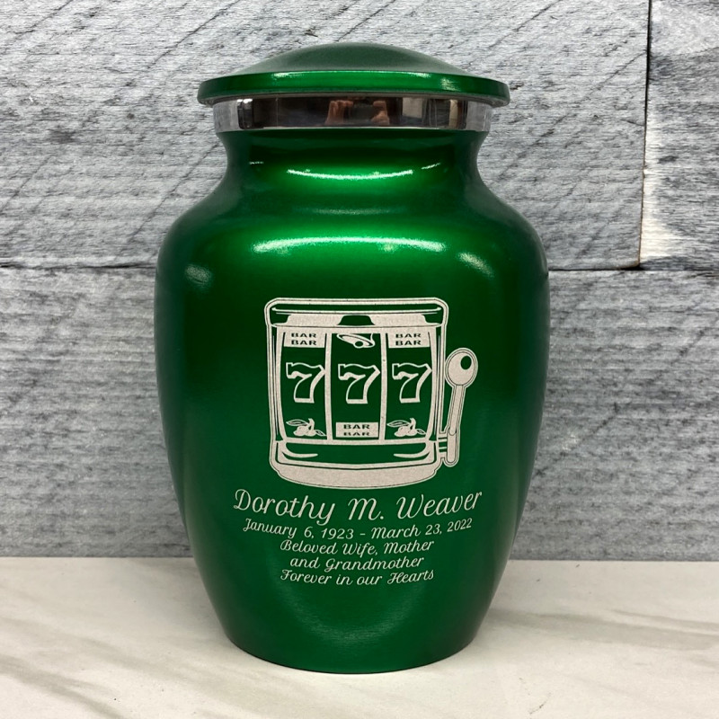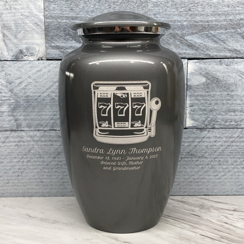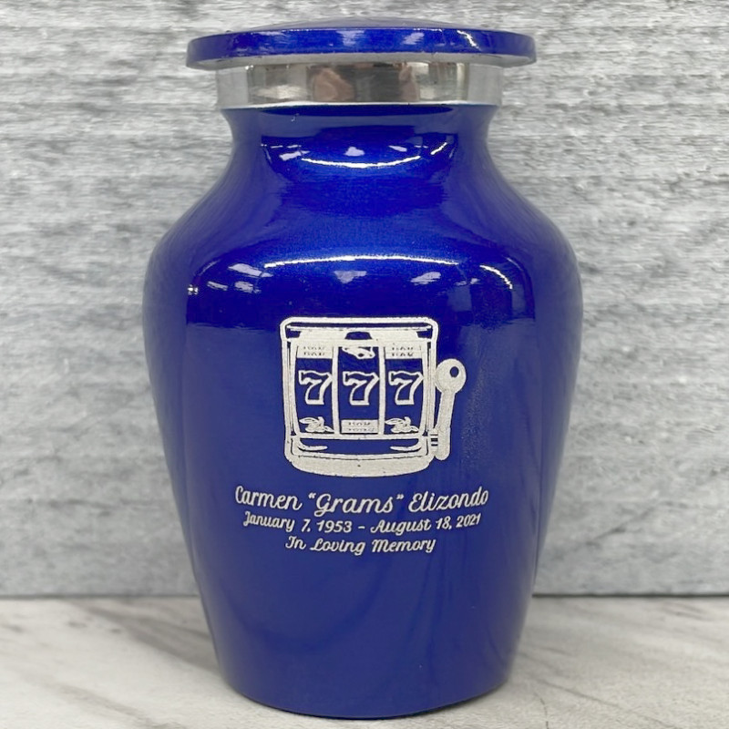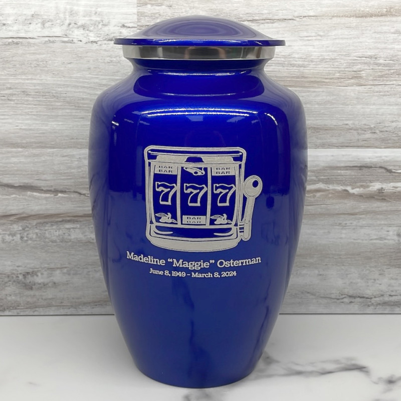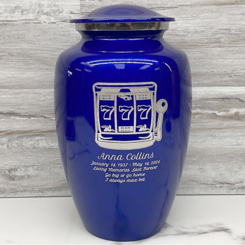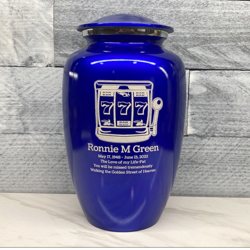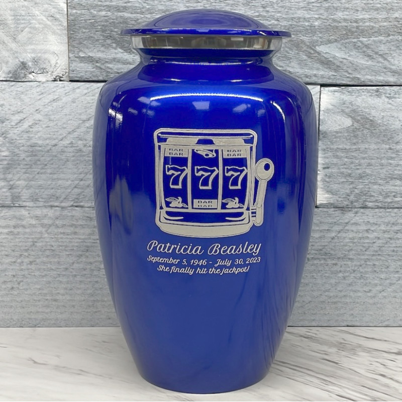 The blue, slot machine pictured urn that I bought from your company, Green Meadow Memorials, was as beautiful and unique as your web site showed. The lovely blue color of the urn is outstanding and since our sister loved playing games of all kinds, this urn is the perfect reminder of her love for gambling and winning, along with her amazing sense of humor.<br /> The selection of fonts, colors and the available inscriptions and poems made it so easy to create exactly what we were looking for to honor her.<br /> When we hold her Celebration of Life in March,<br /> we will be very proud to show this beautiful urn to family and friends.<br /> Also, the speed of your company to ensure we received the urn a full week before your scheduled delivery date was deeply appreciated.