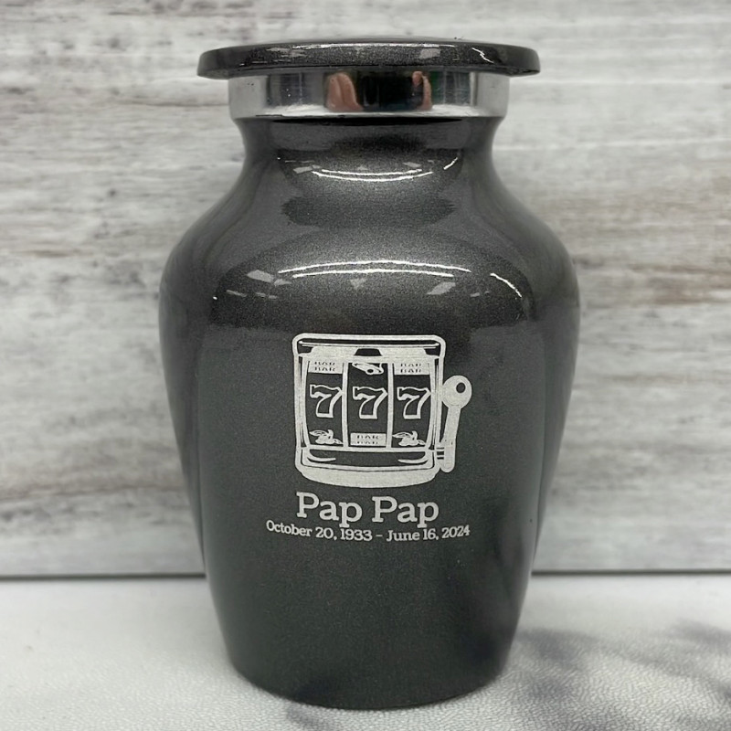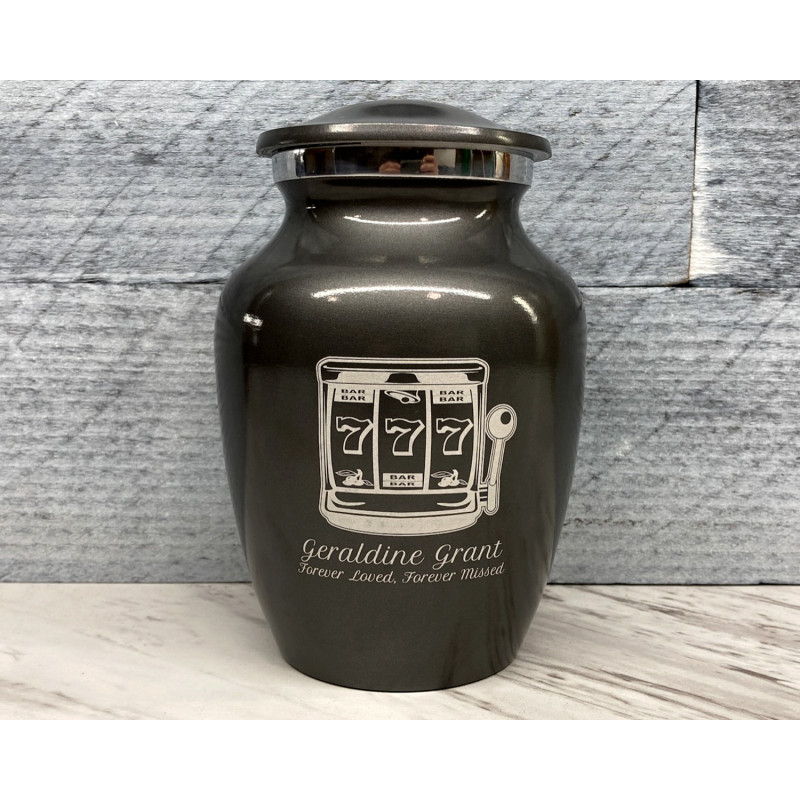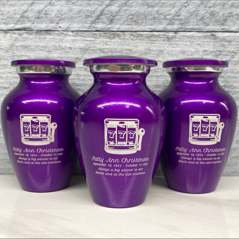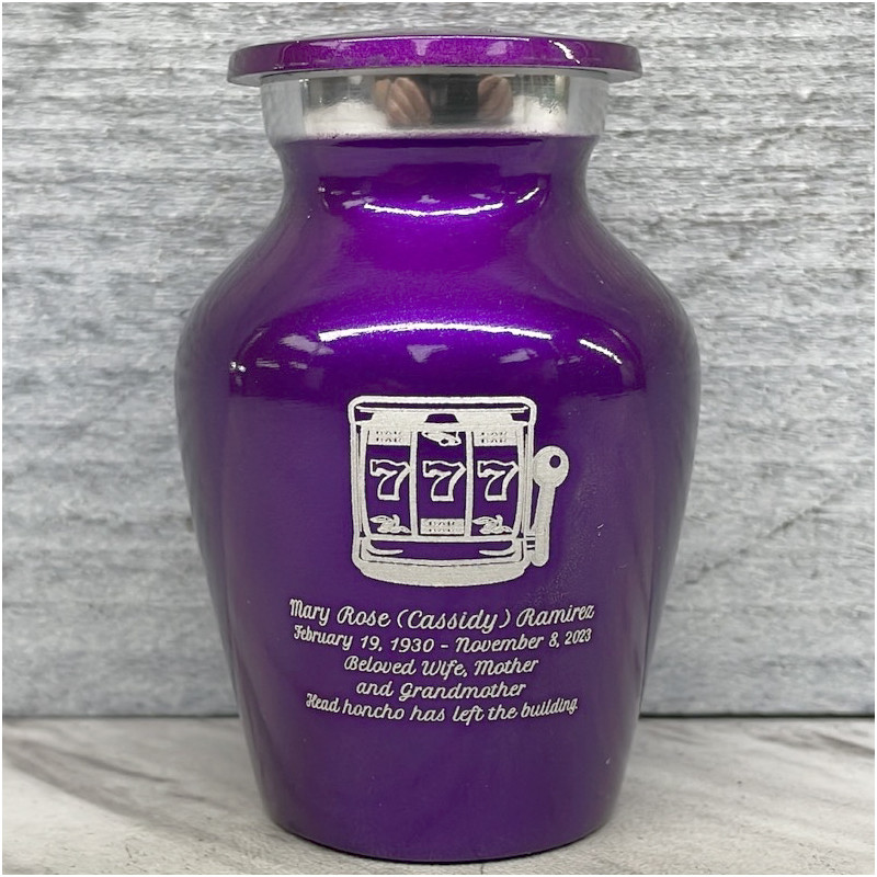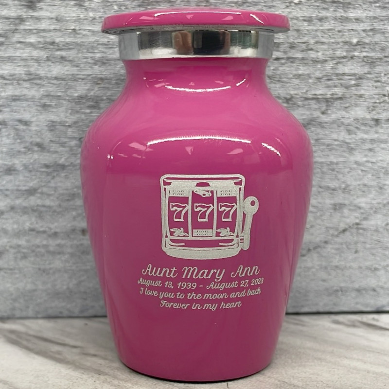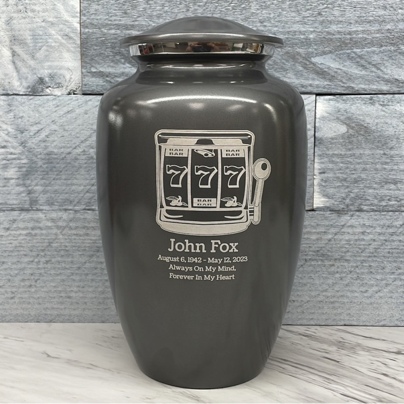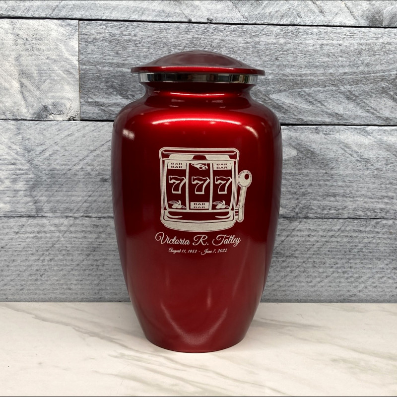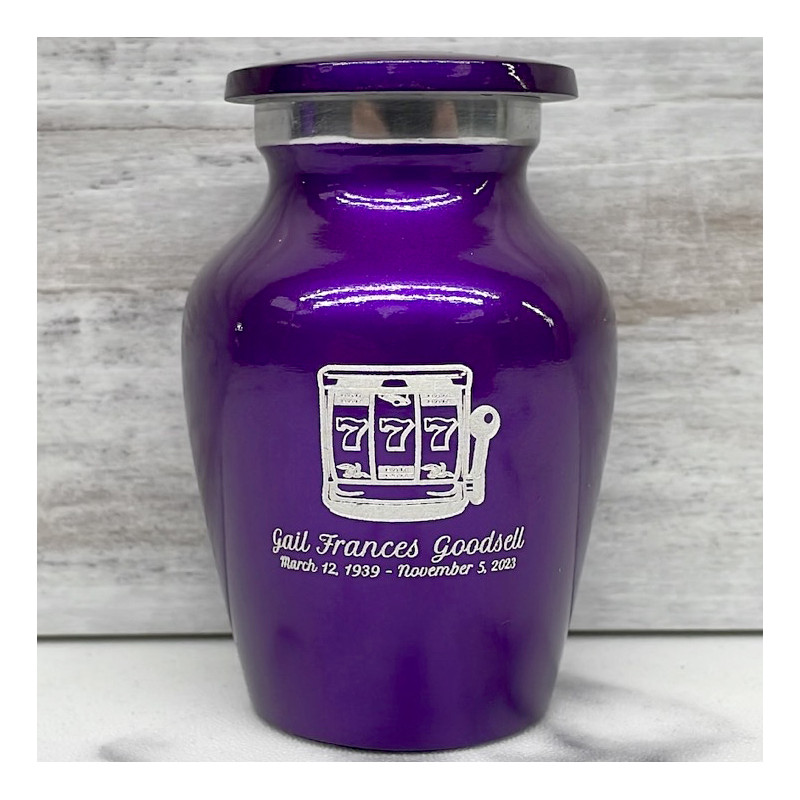 The blue, slot machine pictured urn that I bought from your company, Green Meadow Memorials, was as beautiful and unique as your web site showed. The lovely blue color of the urn is outstanding and since our sister loved playing games of all kinds, this urn is the perfect reminder of her love for gambling and winning, along with her amazing sense of humor.<br /> The selection of fonts, colors and the available inscriptions and poems made it so easy to create exactly what we were looking for to honor her.<br /> When we hold her Celebration of Life in March,<br /> we will be very proud to show this beautiful urn to family and friends.<br /> Also, the speed of your company to ensure we received the urn a full week before your scheduled delivery date was deeply appreciated.