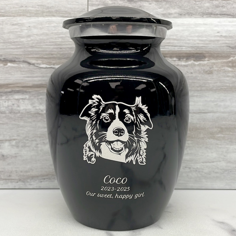 The Small Jet Black Border Collie Sharing Urn Pet Cremation Urn is an attractive and meaningful way to pay tribute to your pet who has passed on. Optional engraving features a name line and two additional lines that can include dates or sentiment lines. Choose from our most popular sentiments, customize them or enter your own text to make it completely unique.