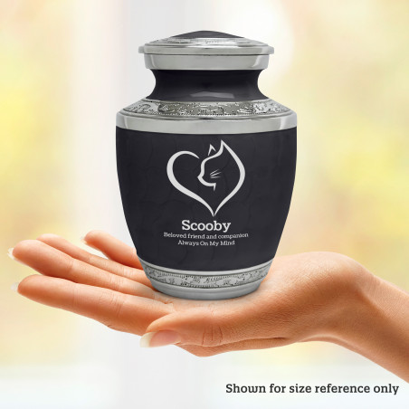 The Small Cat Heart Pet Cremation Urn - Ebony Black is an attractive and meaningful way to pay tribute to your pet who has passed on. Optional engraving features a name line and two additional lines that can include dates or sentiment lines. Choose from our most popular sentiments, customize them or enter your own text to make it completely unique.